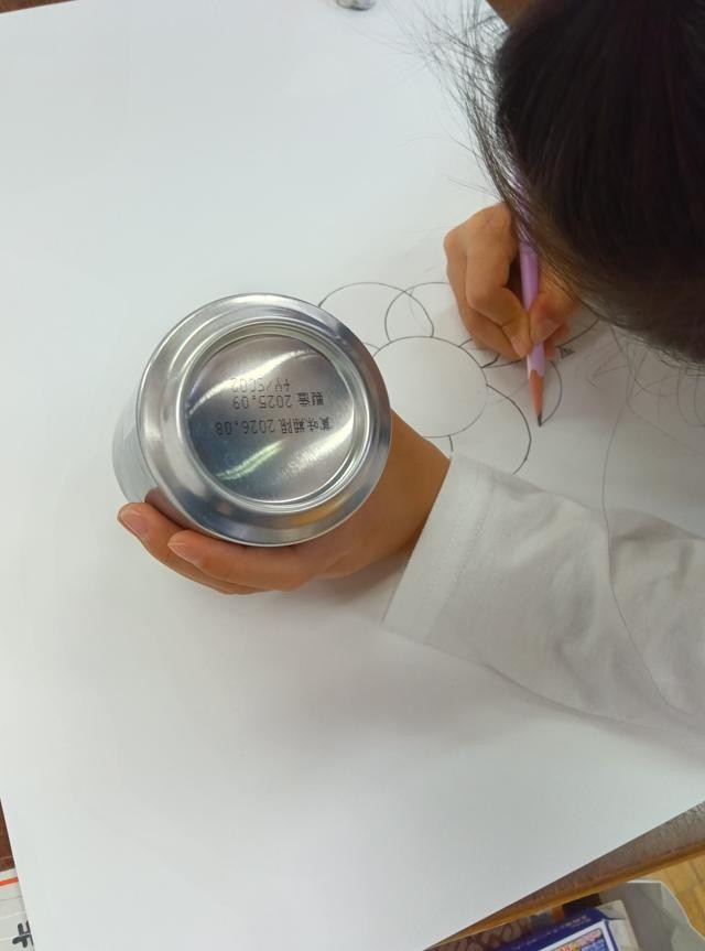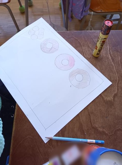 私が特にすごいなあと思ったのは、大きな丸と小さな丸を重ねて、ドーナツのようにしている子の絵でした。シンプルだけど、すてきな思いつきだなあと思います。よく見たら、端は同じ小さな丸の組み合わせで、見たことがありそうなドーナツが描かれています。○○○リング!他のドーナツの淡い色塗りもすてきで、あまりにもおいしそうで、食べたくなりました・・・今日の帰りはミ〇ド!?