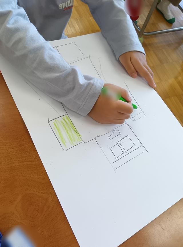 箱の面を画用紙に置き、鉛筆で回りに線を引いていきます。これは面の形を写し取る作業です。写し取った形を重ねたり、並べたりして絵や図柄を描き出していました。