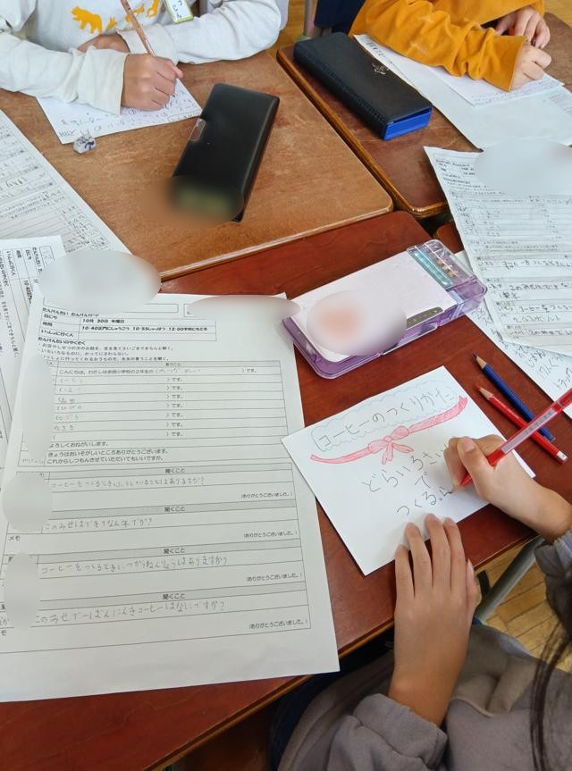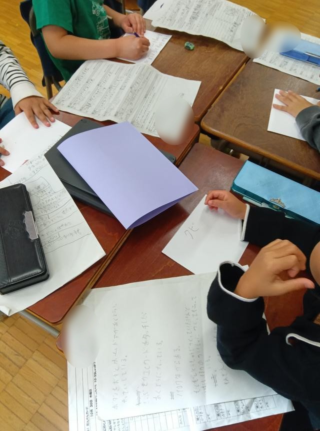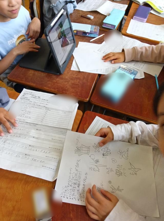 行った時の記録や写真を見ながら、どんな風にまとめていくか話し合いながら進めていました。ガイドブックのような形でまとめていくようです。先生が作ったサンプルが廊下に掲示されていて、どの学級の子も見られるようになっています(私がサンプルになっているので掲載は差し控えます)。具体的な形で提示されているので、参考にしやすいですね。