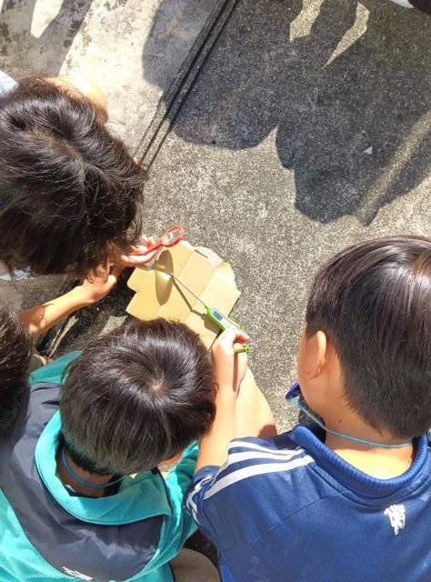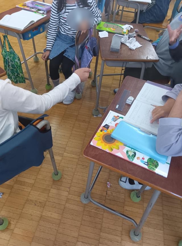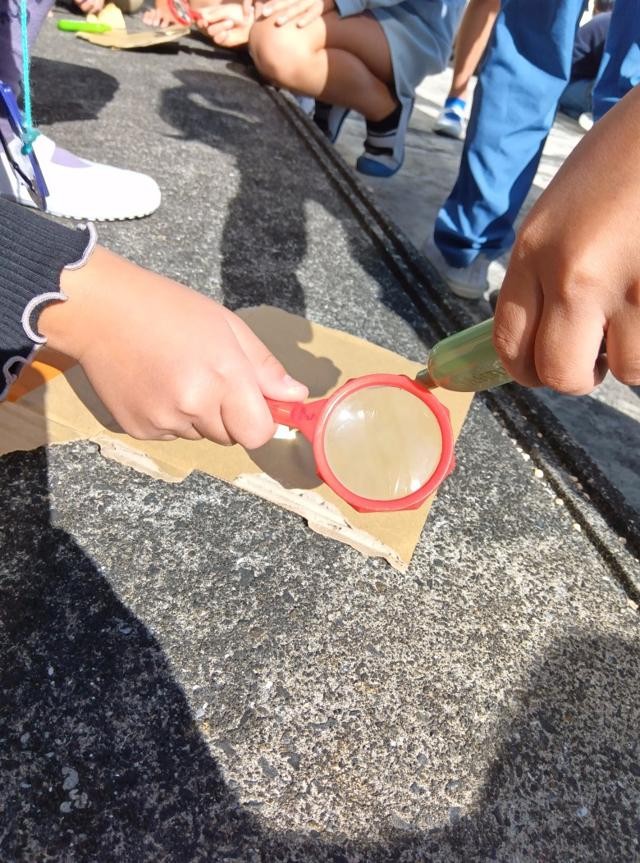この日は、教室で虫眼鏡など、道具の準備をして実験に出かける用意をしていました。ジャンケンをして、虫眼鏡を持つ役など、分担を決めていました。虫眼鏡が人気です!教室をいろいろと回っている途中だったので、おそらくこの後下に行って実験を行うだろうなと予想して、その後の教室をざっと回ってからその様子を見ようと急いで(走らずに!)下に下りようとしたところ、