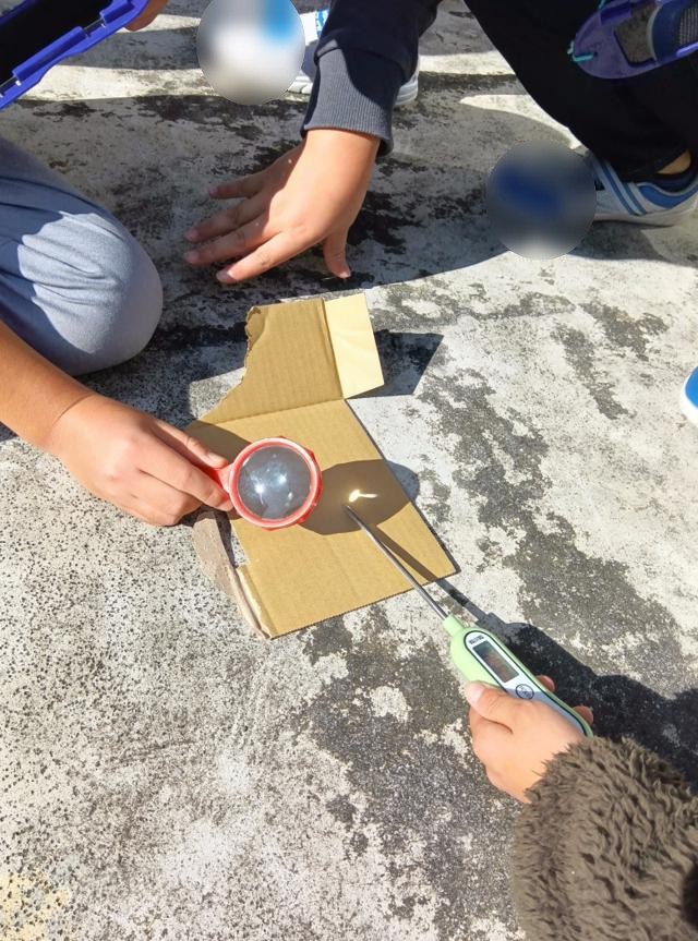 先ほどの3年生の姿が4階にありました。どうやら4階理科室前のバルコニーで実験を行うようです。こんなところで出会えるとは、ラッキー!確かに、この時間だと太陽が真上近くにあるし、ばっちり日も当たっていて、この場所は実験には最適です。実験では、虫眼鏡で光を集めてダンボールに当て、その部分の温度を測っていました。