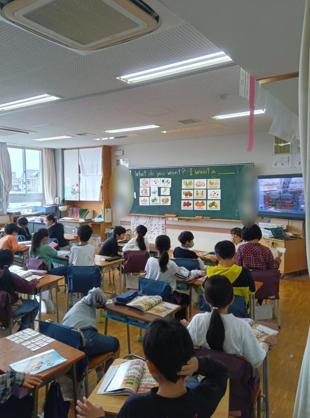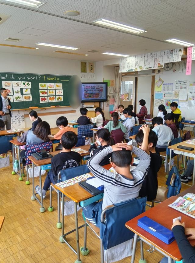4年生の外国語活動では、たくさんの fruit&vegetables の単語を使って、活動をしていました。先生が上の形で言う野菜や果物を指さします。