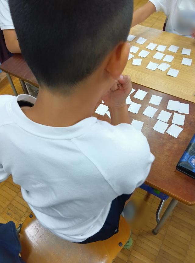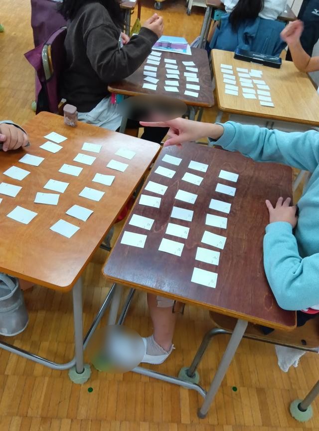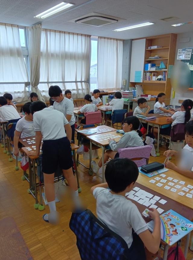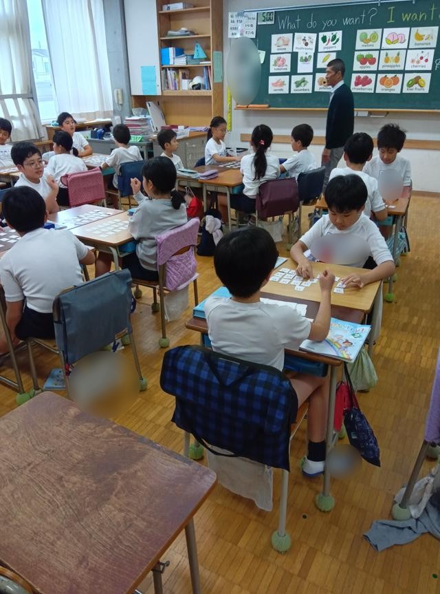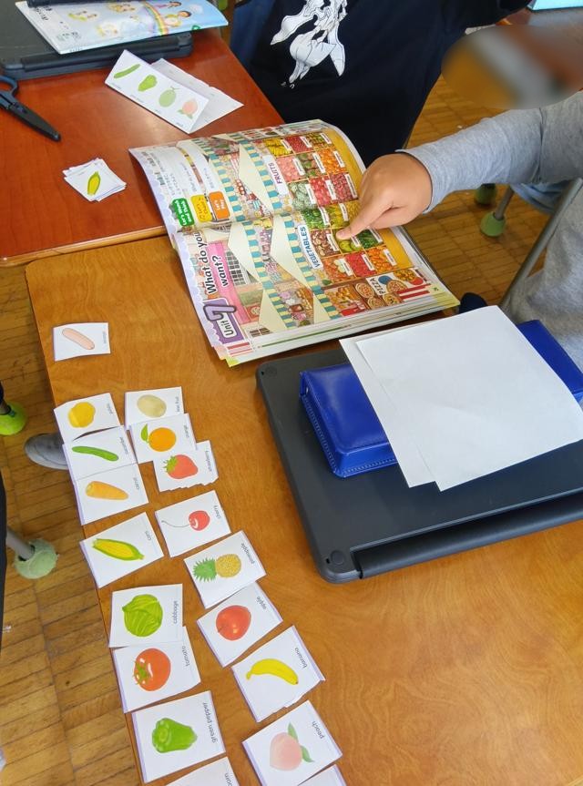 それはさておき、これだけ多くの単語が出てきているので、繰り返しゲームの内容を変えながら取り組みます。次に見たときには、神経衰弱をしていました。もちろん黒板には、fruit&vegetables のカードがあります。ただゲームをするだけではなく、いろいろなところで発音せざるを得ないようになっているので、繰り返し取り組んでいるうちに少しずつ覚えていきます。そしてまた忘れた頃にどこかで再登場・・・こんなことを繰り返しながら、今の小学生たちの英語の語彙力はなかなかのものになっていると思います。