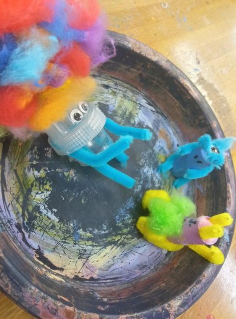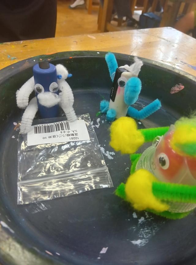 キャップ(ふた)から生まれたかわいいキャラクターです。一口にキャップと言っても、その形や大きさ、太さや長さは様々です。身近なペットボトルやペンのキャップ以外にも、珍しいところでは、メロンアイスのふたから生まれたキャップンもいました。キャップやふたにモールや綿で装飾を付け、「動く目」を付けて生み出していきます。この「目」が命を吹き込む感じがしました。6年生の社会科で奈良時代の大仏の開眼(かいげん)式の様子の資料などが出てきますし、だるまの片方に目を入れて叶ったらもう1つの目に、なんていうこともあり、
