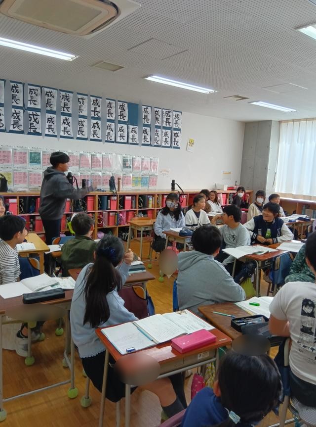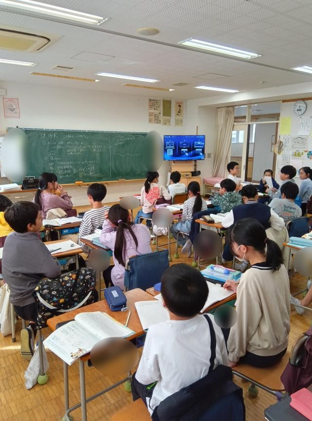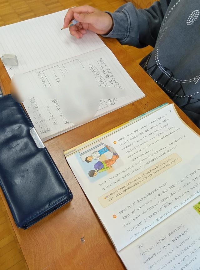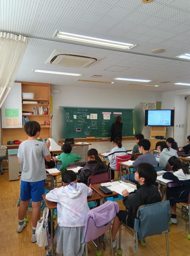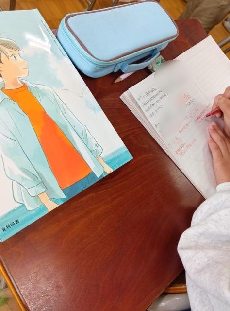 の教材を基にみんなで考えていました。5年生の道徳では、ノートは、大学ノートのようなものを使っていて、自分の考えや友達の考えを書き込んでいます。そのノートを使って、交流したり、考えを深めたりしていきます。よく自分の考えを表現したり、自分とは違う友達の考えやそれに対する考えを書いて深めているなと思いました。