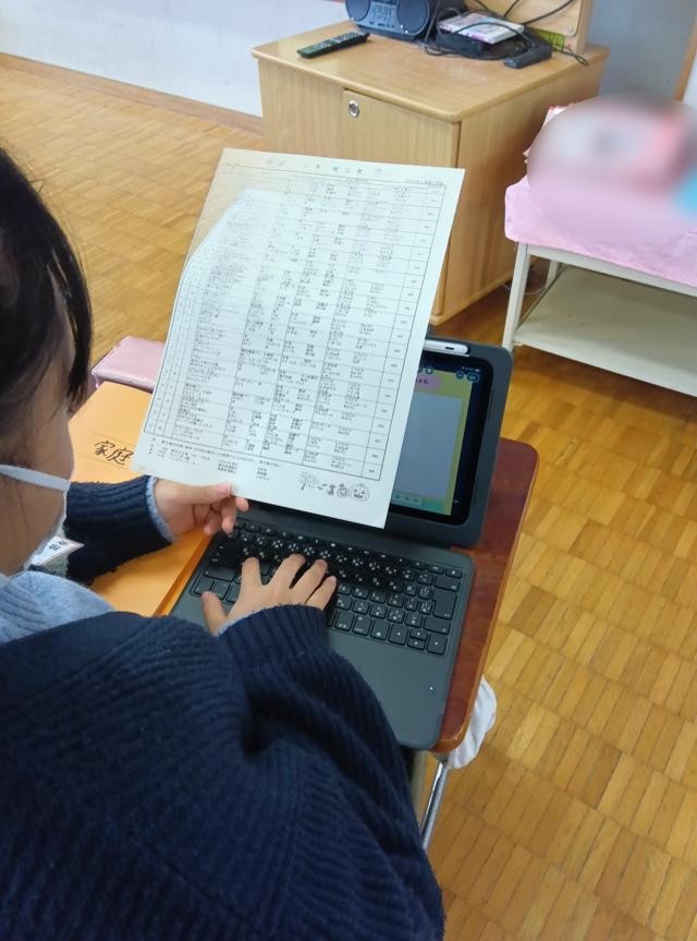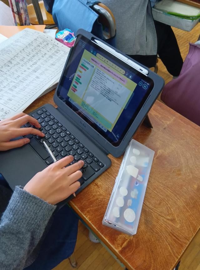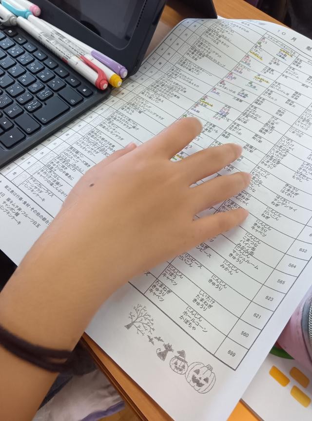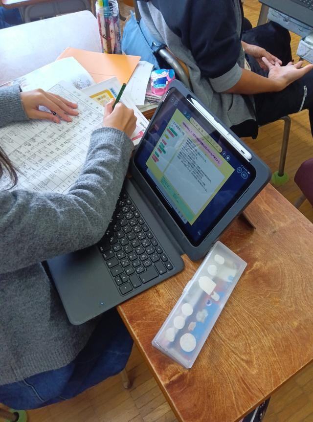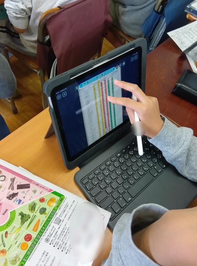 一方、家庭科では、給食の献立表を見ながら何やら作業をしています。給食の献立で栄養素のバランスについて分析をしているようです。学習のタイトルは、