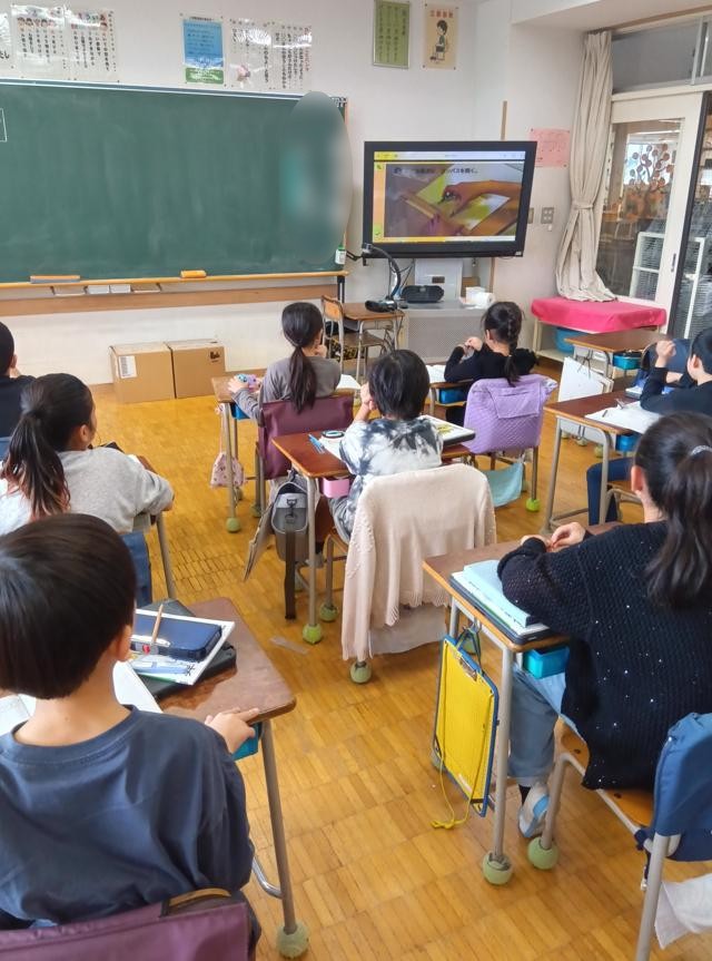 いよいよコンパスで円を描く活動を行っていました。まずは、コンパスの使い方を確認します。針もついているので針に気を付けることや、使う前にネジのゆるみを確認することなど、安全指導も行っていました。動画と教員用の大きなコンパスを使って行っていきます。この大きなコンパス、