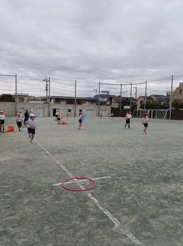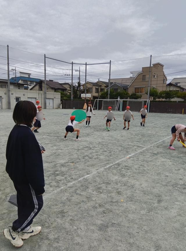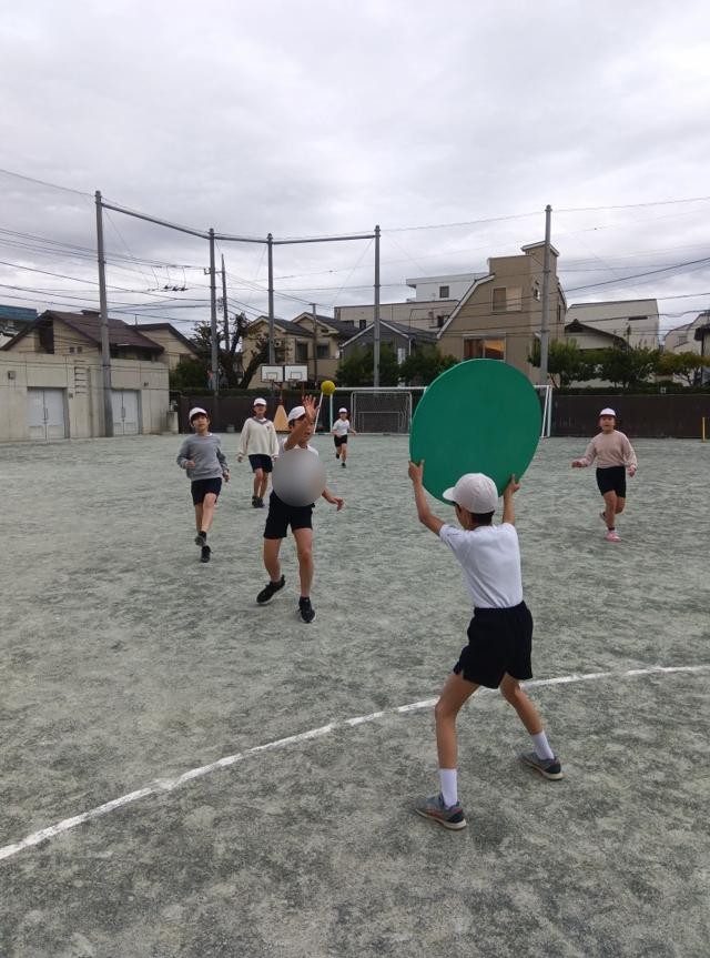 4年生のベースボール5では、手で打つのでそこまでボールは飛びませんが、ティーボールはうまく当たると結構ボールが飛びます。写真でも分かるように、打者によって前に来たり、後ろに下がったりして守備をしていました。飛ぶと思っていたら、意外に飛ばず急いで前進したり、逆に意外に飛んで急いで下がったりということもあります。前進守備の子たち、腰を落としてなかなか様になっています。強い球が来ませんように・・・。アウトにするための板を持った児童のポジションも大事です。このルールでは、守備の動きもおもしろいです。今回の写真は、守備の様子がよく分かります。最後の2枚、アウトにする瞬間です。投げる方もフルスイングです。写真、小さいかも知れませんが、ぜひ大きくしてよく見てください。