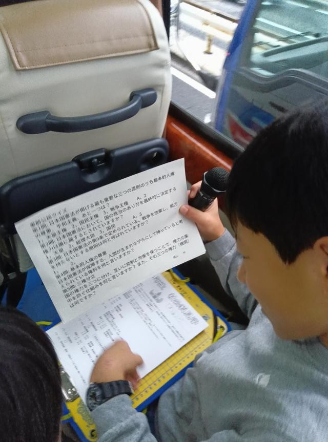 車内ではレクも始まりました。クイズですが、そこはさすが社会科見学のレスです。政治の問題や歴史の問題が出され、盛り上がっていました。