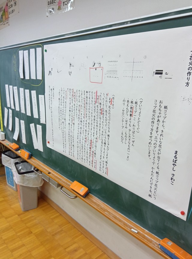 2年生の国語の説明文「紙コップ花火の作り方」の学習、本文から読み取った説明の「わざ」をまとめていました。