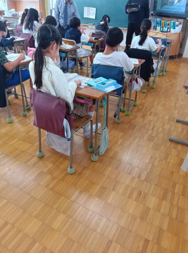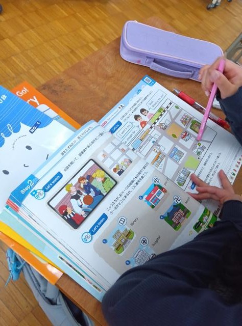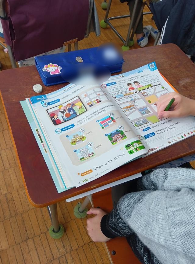 5年生の外国語の学習です。道案内の場面を使って学習していました。