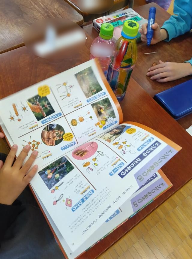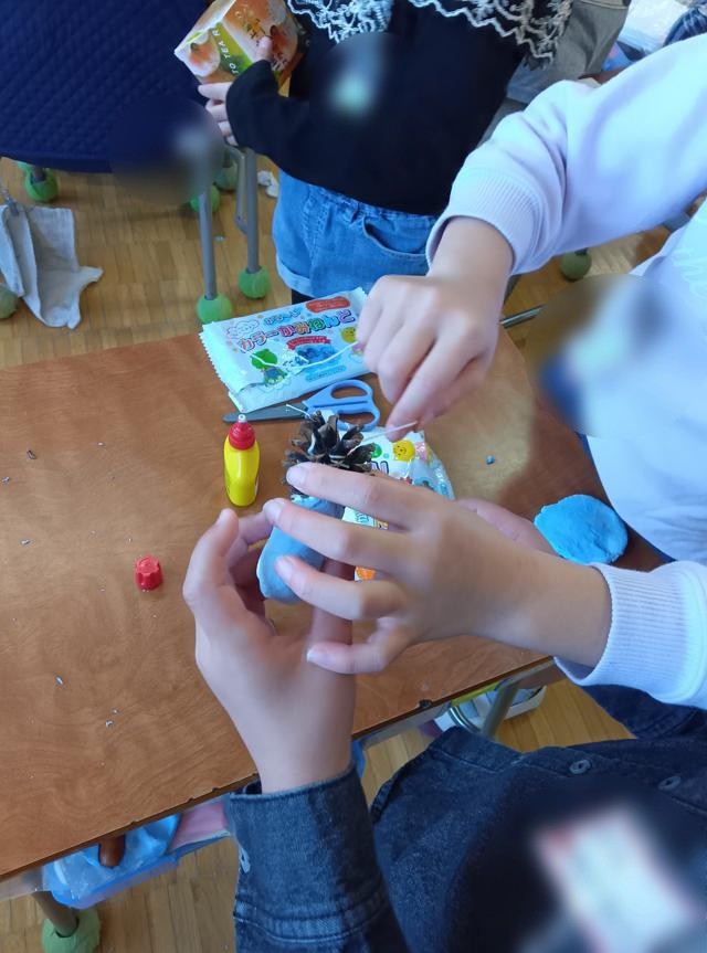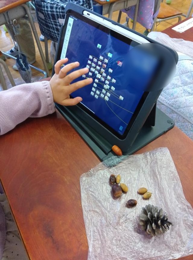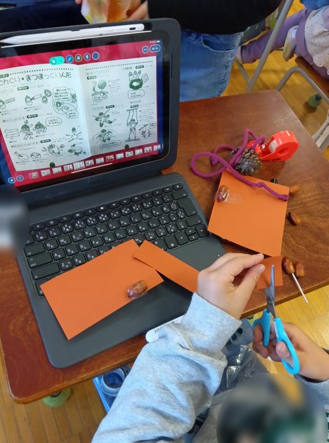 作品を作って、ロイロノートで共有して、それを見た友達が自分も作りたくなって、次の作品を作る・・・なんてこともあるみたいです。それもそのはず、材料はまだまだあるようで、どんぐりや木の枝などがたくさん置いてありました。先日、朝顔の弦を持って登校してきた1年生を見ましたが、それもどこかで使われているかもしれません。