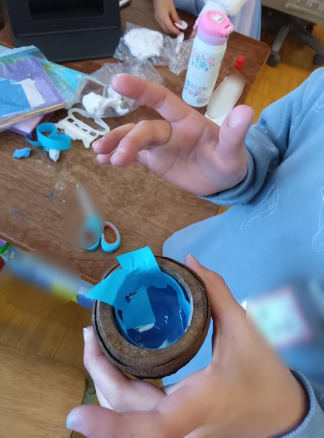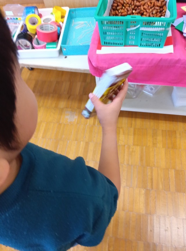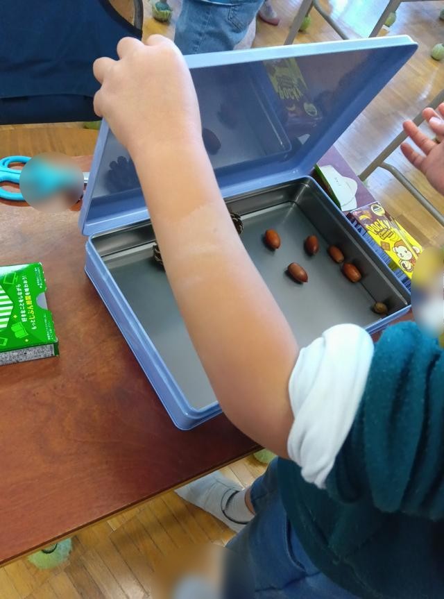ある子が呼ぶので行ってみると、お菓子の金属の箱に何か入れているようで、それを見せてくれるようです。大事そうに開けたその中に、どんぐりがころりといくつか入っていました。固定するわけでもなく、山ほど入れているわけでもありませんが、この子にとって宝物のように大切なものなのだろうと思いました。もしかしたら、自分で取ってきたお気に入りのどんぐりとか、大切な友達にもらった大事などんぐりとか・・・この箱も宝箱に見えてきました・・・ここはもしや「新・お宝島」!?