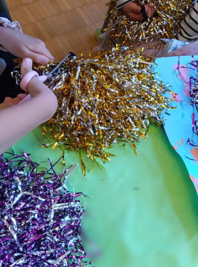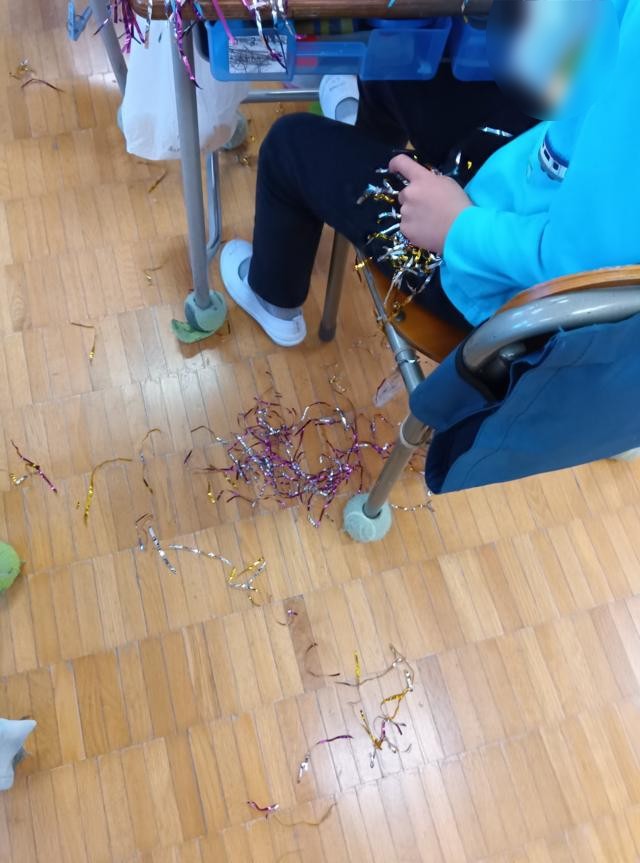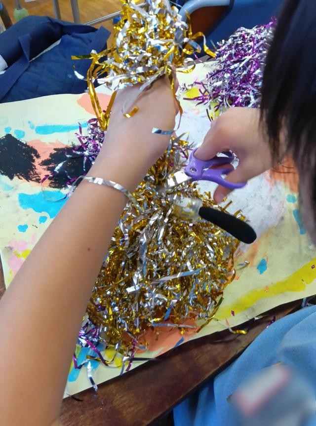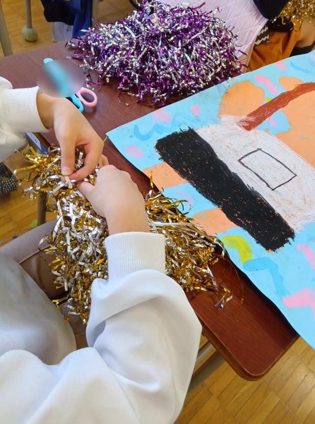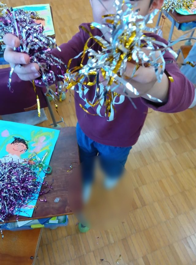 1年生の図工の学習です。前にチラッと話題にしたんですが、運動会で使ったポンポンを図工で使うようです。