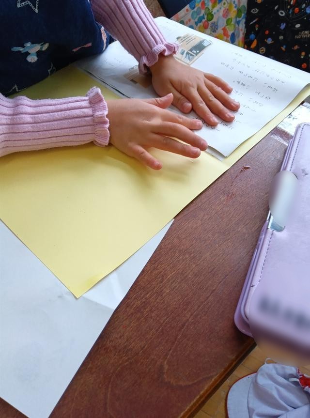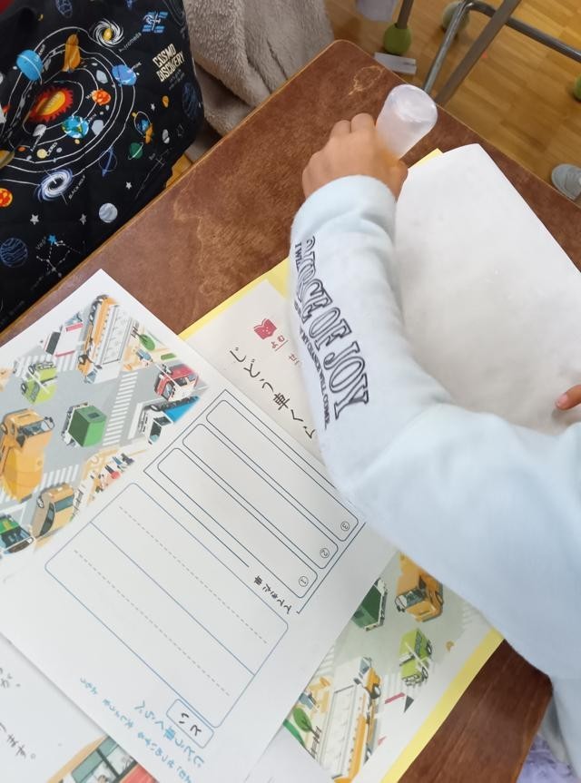 結構技術が必要で、1年生くらいだと、、「逆から貼り始めてしまう」とか「上下が逆さま」ならまだ良い方で、思いっきりずれてたたんだときに大きくはみ出したり、その結果のりが別のところに付いてそのまま貼り付き、二度と開かなくなったりすることも・・・開かずのワークシート、恐ろしい、というよりも全く使うことができないというのが悲劇です。こちらのクラスでは、黒板に貼ってある手本も参考にしながら、上手に作っていっていました。