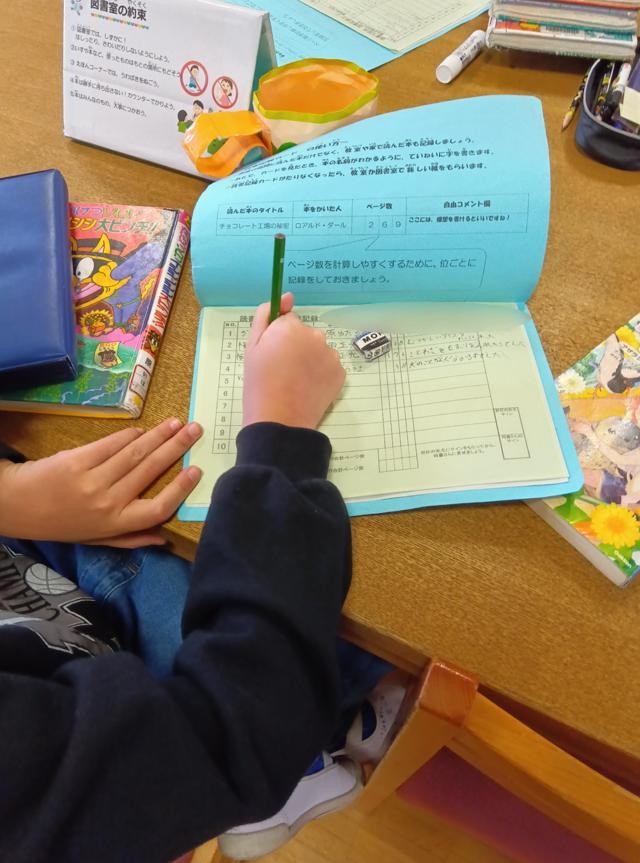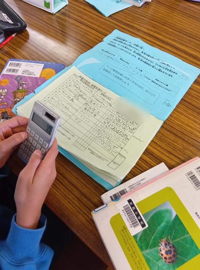 どの学年でも、読んだ本を記録していきます。学年により年間の目標の数字がありますが、この読書月間中の目標の数字も設定されています。学年1ファイルで記録が残っていると思いますが、後でみたらおもしろいでしょうね。ある子は、計算機でページ数の計算をしていました。たぶんページごとに小計を出し、ここまでのトータルを出していくのだと思います。中学年以降はなかなか大きな数字になってくるので、計算機が必要な場合もあるんですね。