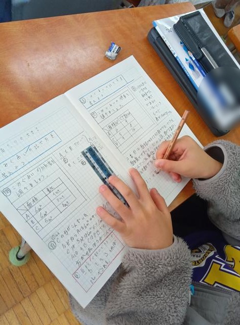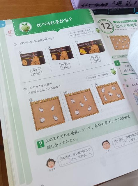 そんな風に考えて、計算をしますが、この学習の難しいところは、計算をした後にあります。何で比べるかによって、値段で言えば、大きい数値が安い場合と小さい数値が安い場合があるのです。そこからは国語の問題になっていきます。ちょっと今回の具体例では分かりづらいかもしれませんので、どこかこの先でまた紹介したいと思います。