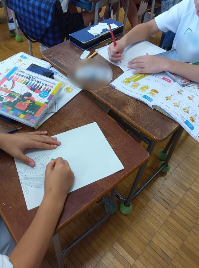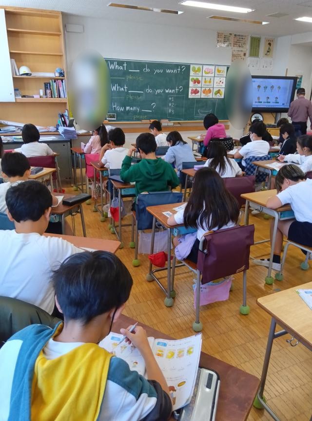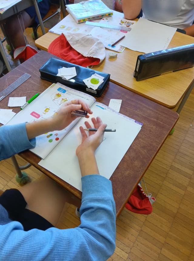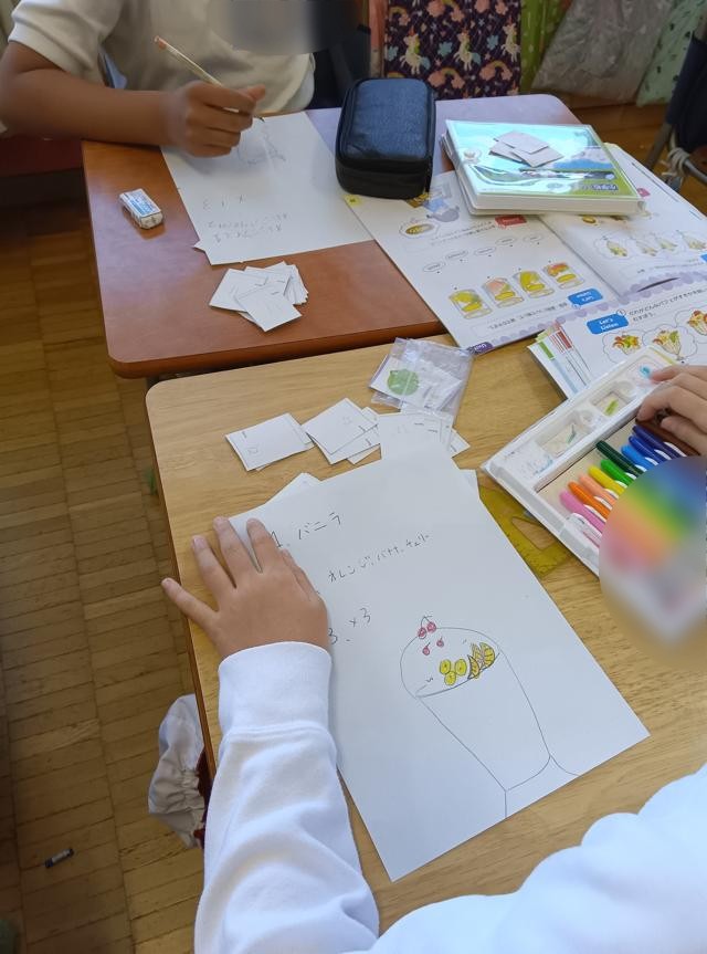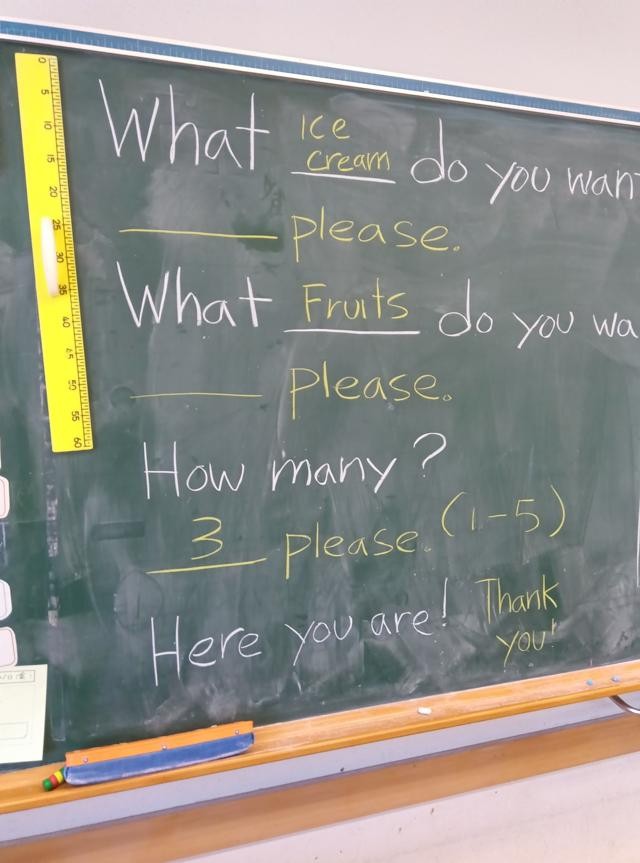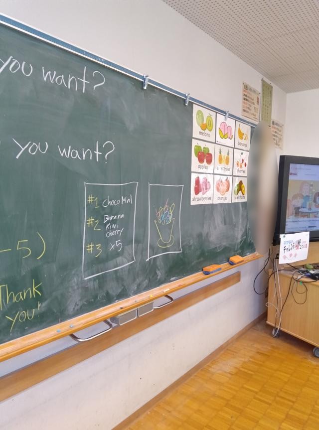 の表現を使って、友達とやり取りをしていました。「パフェ」を作っています。友達の希望(want)を聞き、相手の好みのパフェを作る活動のようです。