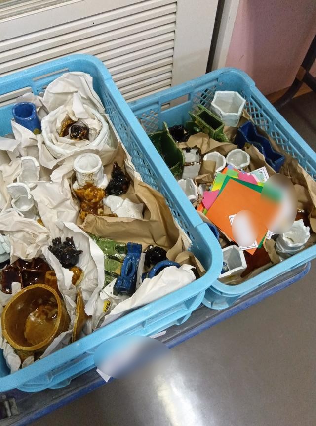 今、いろいろな学年で、作品が出そろったものから、出展する作品を決めていっています。この後、図工室前を通ると、立体作品の出展の準備も進められていました。こちらも2つの中から選ぶ学年と、1つに決めて作っている学年があります。出展しない方の作品は、図工室前や教室、廊下での展示、掲示などを行ったり、持ち帰ったりします。お家でも子どもたちの作品を楽しんでいただければと思います。