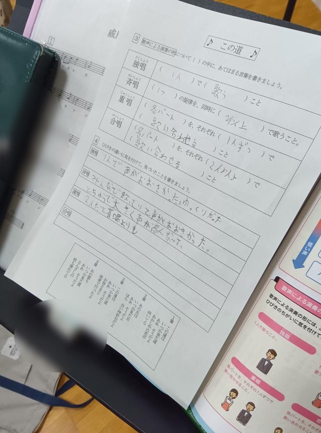 練習中、空いた席には、この時間に行った「この道」という曲の鑑賞の感想などがありました。