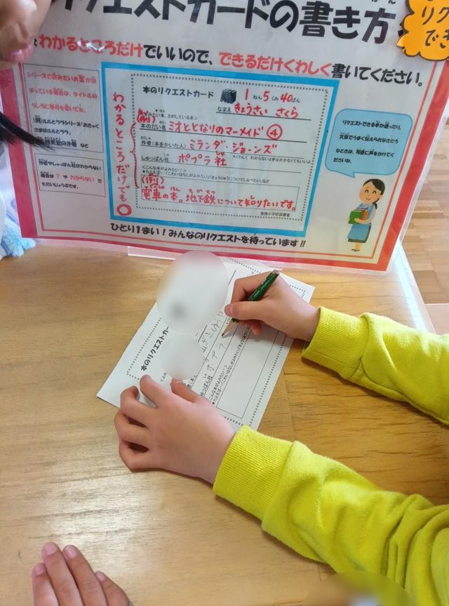 京西小学校の図書室には、本のリクエストをすることができます。リクエストコーナーがあり、「本のリクエストカード」を書いている子がいました。今後の図書購入の際には、そこからのリクエストも採用され、新しい本が購入されます。楽しみに待っていてください。