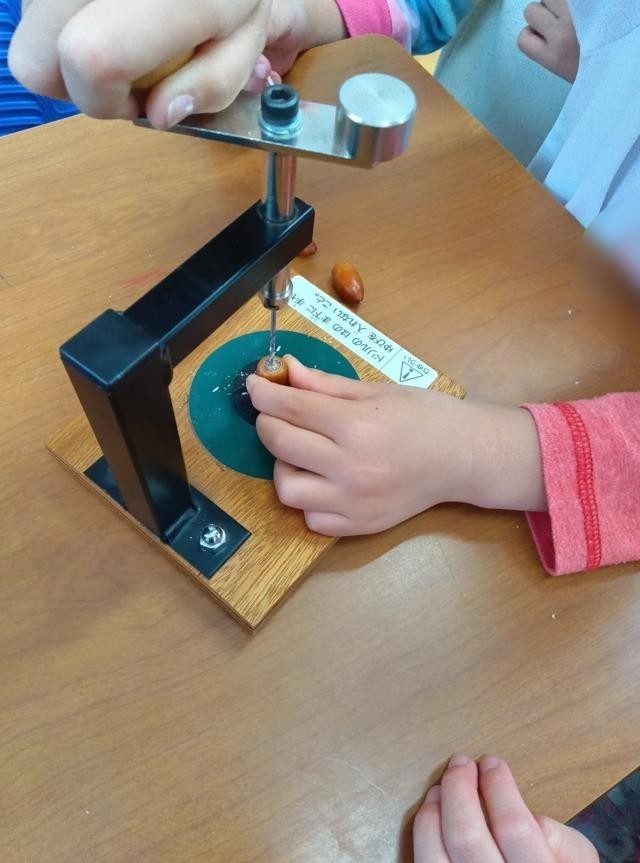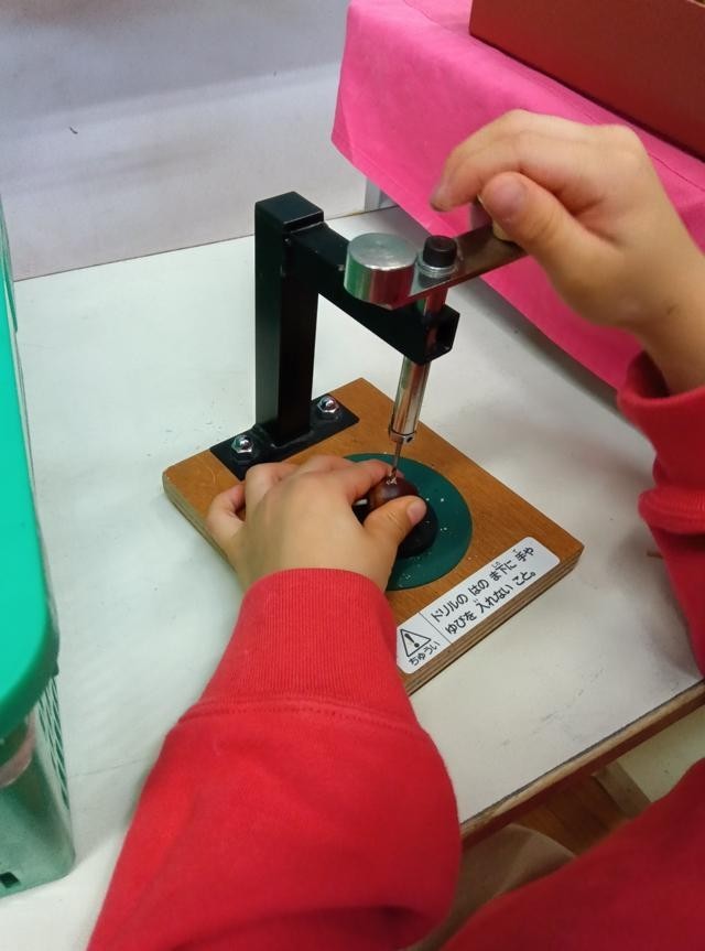 さて、今日もう1つご紹介するのは、最近1年生がよく使っている道具です。最近、秋さがしで見付けてきた自然物で工作を作っている1年生、そのとき、「どんぐりに穴を空ける機械」です。そう、名称はよく分かりませんが、本当にそのためだけに使う機械です。他にも、キリで穴を空けるために下を固定する道具などもありますが、こちらの道具なら、安全に気を付ければ子どもたち自身でも扱うことができるのでよく使っています。家にマカダミアナッツの殻を割る道具があるんですが、それと同じかそれ以上に他には使い道のないニッチな道具だなと思いました。