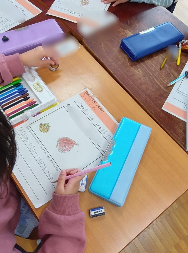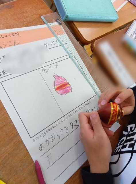 順番は逆になりましたが、その後に別の学級で植える前に球根の観察をしているところに出会いました。球根をよく見て、時々触って感触を確かめるなどして観察をしていました。自然と触った感触を確かめるところなどは、これまでの生活科の学習での観察を通して培ってきた学習の力ですね。