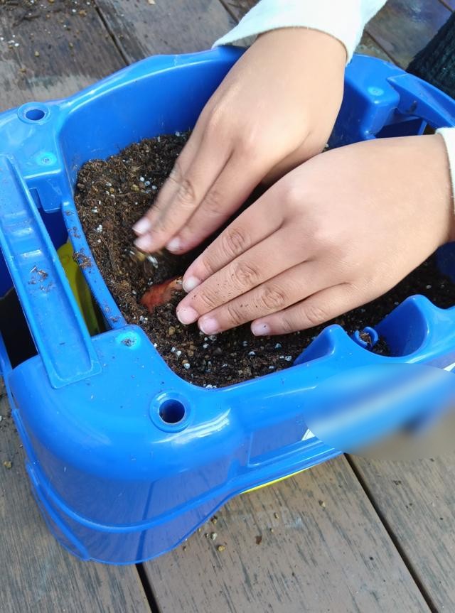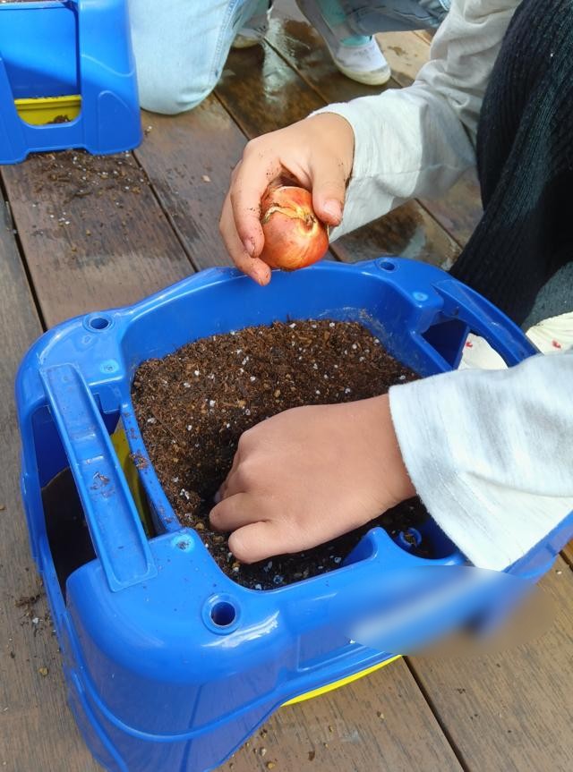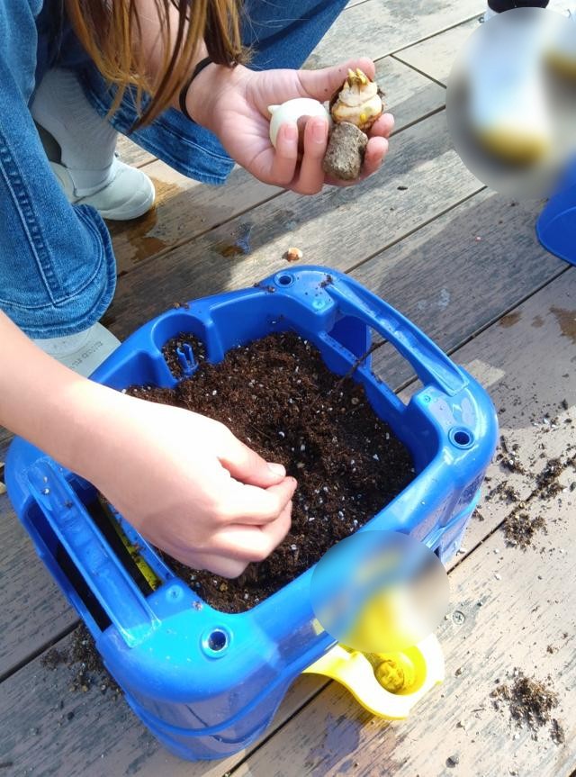 土が入ったら、そこに固形の肥料を入れ、いよいよ球根を入れていきます。球根はすぐに出てくるわけではなく、寒い時期はこのまま眠っていて、暖かくなると育ち始めます。寒い時期を長く過ごすので、心地よいベッドを用意してあげます。土を掘り、そこに球根を置いたら、そっと土をかぶせてあげました。