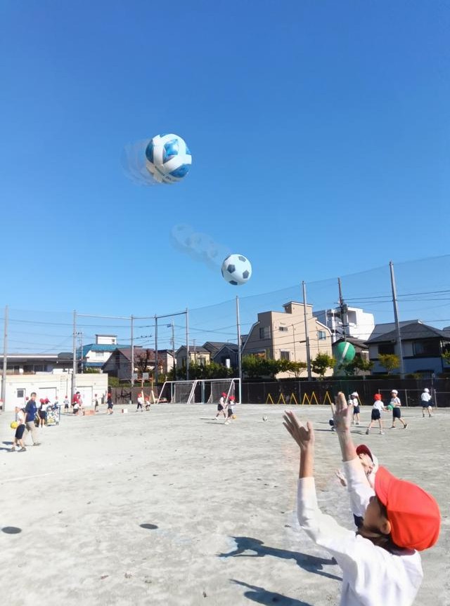 というわけではありませんが、少し前の1年生の体育です。ボールを使った運動をしていました。まずはウォーミングアップです。ボールを突いたり、高く投げたりして、投げる動きとキャッチする動きを練習してます。高く投げて、ボールが落ちてくるまでに何回手を叩けるでしょう。手を叩くことに夢中になるとボールは地面についてしまいます。高く投げ、かつ真上に投げるコントロールも必要です。遠くに投げてしまうと手を叩くどころではなく移動してボールをキャッチしなくてはならなくなります。こんな風にしてボールを扱う感覚をつかんでいきます。