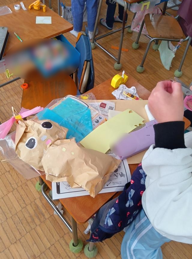 早く作ったクラスは昨日持ち帰っていましたが、ちょうど下校時雨がポツポツとしたときがあって、「わーっ」とお友だちを頭にかぶったので慌てて止めました。このお友だちは極めて水に弱いです。大事にしてあげてください。急な雨には、貸出用の傘もありますので。