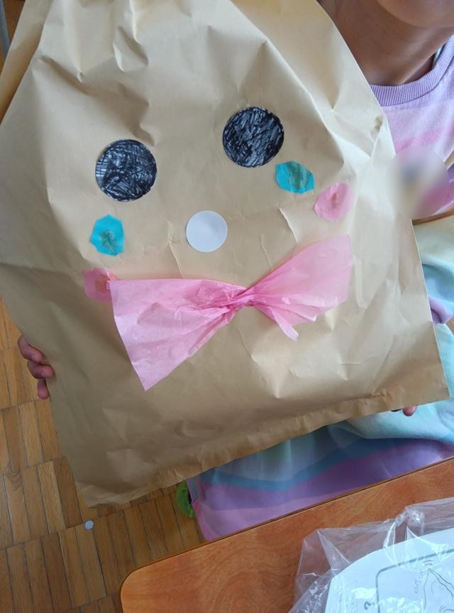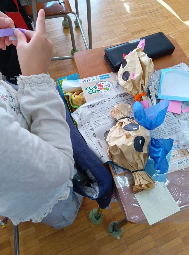 袋状の紙に、ぎゅっとしたくなるようにふわふわになるアレを入れます。少し写真でも見えていますが「新聞紙」です。軽くくしゃっとしてボリュームを出した状態で入れていきます。端をキャンディーの包みのように絞って閉じたら形は完成です。両側を結んでひと工夫も。ただ、このままだとただのぎゅっとしたくなるクッションなので、飾り付けをして「お友だち」に変身です。ここは特に個性が出ておもしろいですね。目の作り方がじょうずで感心しました。