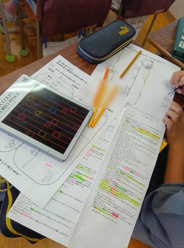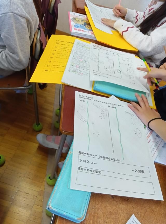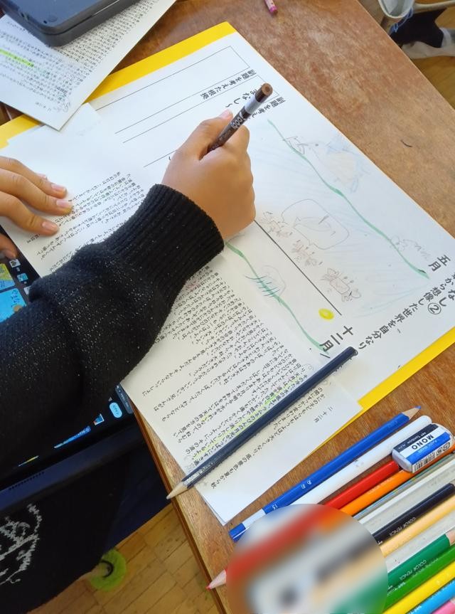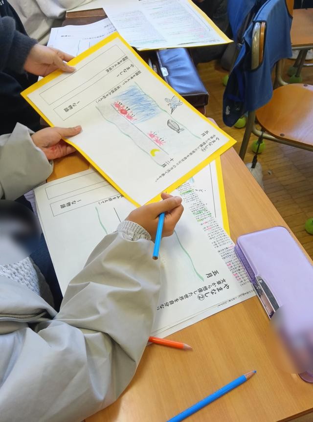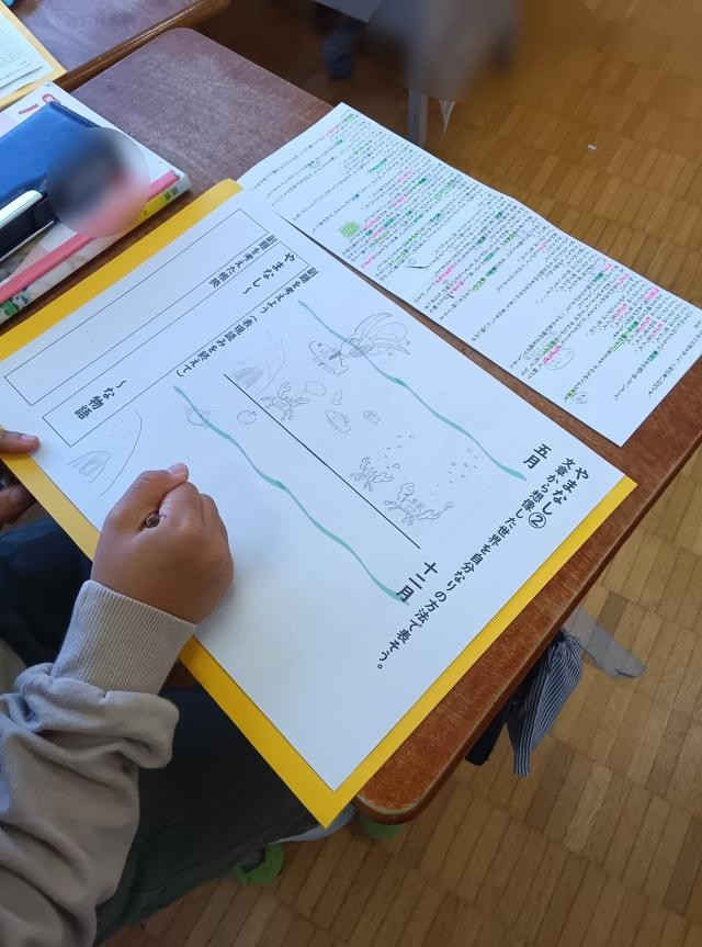宮沢賢治さんの「やまなし」お読みになったことありますか。ある川の底で起こるできごとやそこにいるカニの親子たちが繰り広げる会話を中心にお話が進んでいきます。場面としては2つ、「五月」「十二月」です。この日は、まだ学習の序盤ですが、それぞれの月の川底や川面の様子を絵で表して比べていました。
