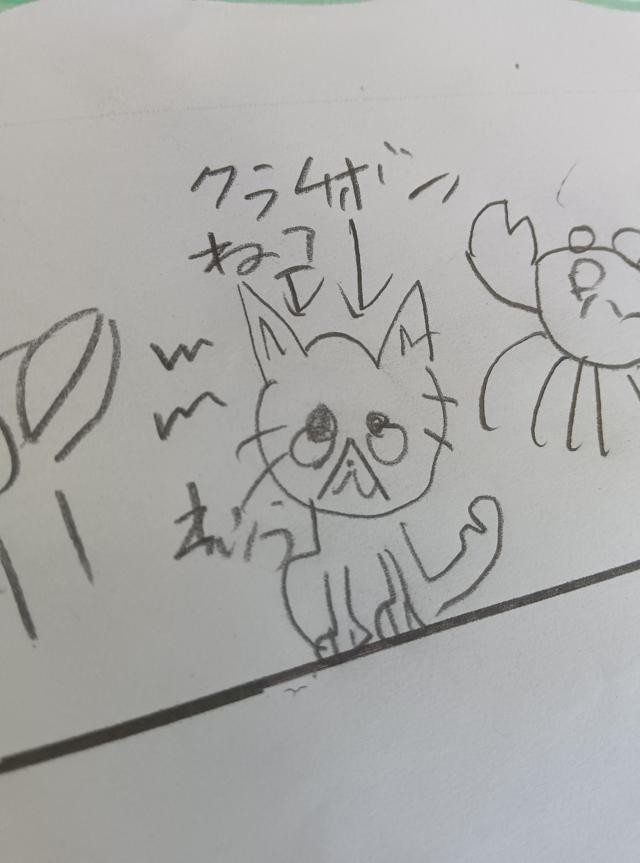 それぞれよく表されていました。そして登場する「クラムボン」・・・プランクトン、光、波の動き、アメンボ、泡、ごみ、カニの幼生・・・様々な説はありますが、答えはありません・・・が、今回「クラムボンはネコ」という新説もありました。私もそこそこ長く教員をしていますが、ネコ説には初めて出会いました。ネコ好きとしては賛成ですが、そう言う根拠は・・・。答えはありませんが、根拠をもって語ることはできます。文中に根拠を見付けて「だからこう」ということです。今回の絵ももちろんただ書いているのではなく、文中の言葉や表現から表しているものです。ネコ説の根拠、今度行ったら聞いてみたいと思いますニャン。