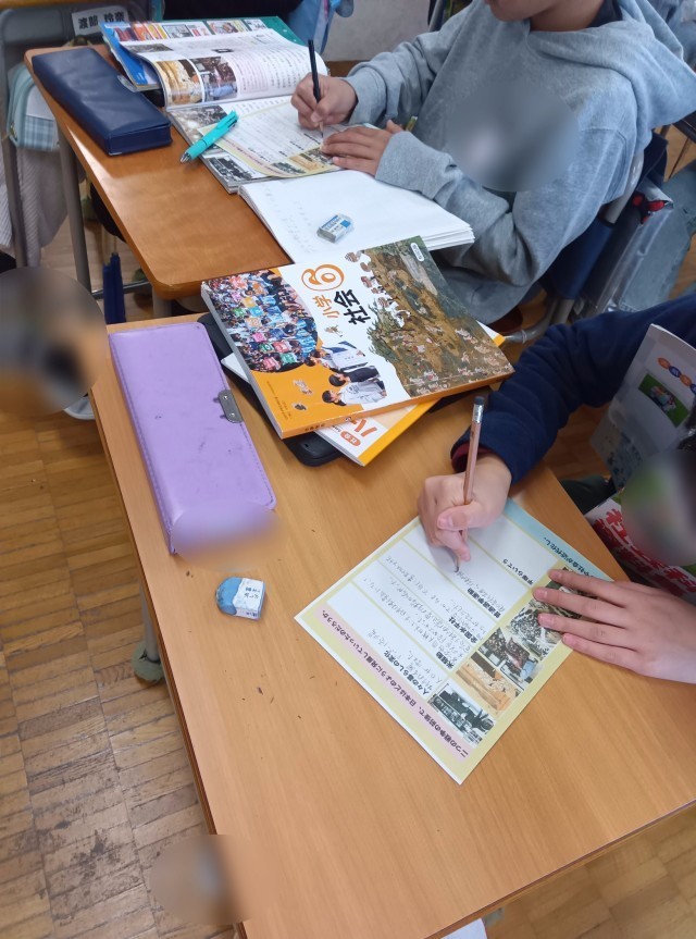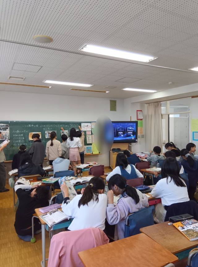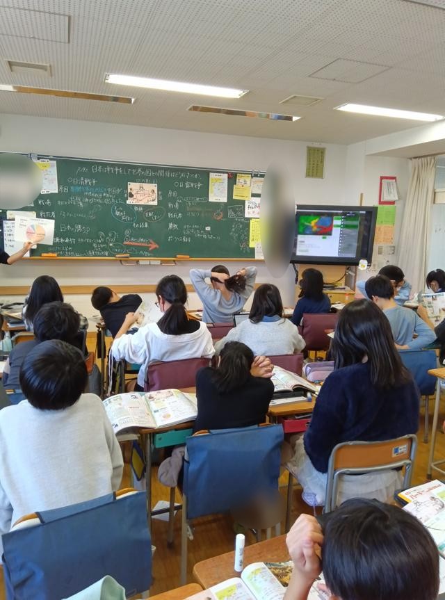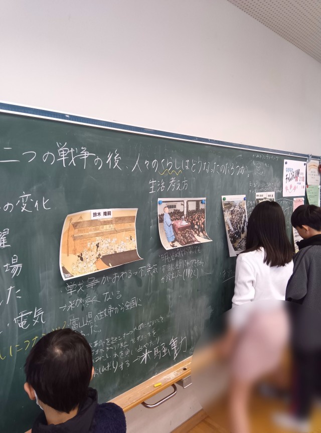 最新の授業(子どもたちが黒板で書いている授業)では、戦争後の人々の暮らしや社会の動きについての内容でした。歴史の授業もだいぶ現代に近付いてきています。