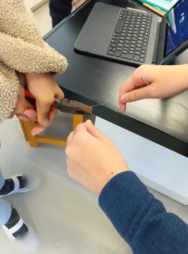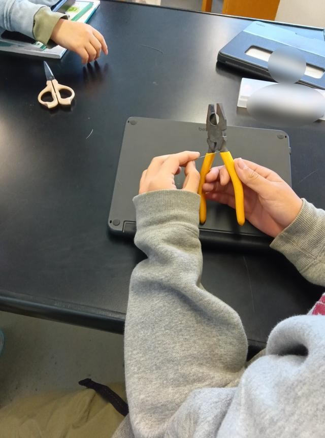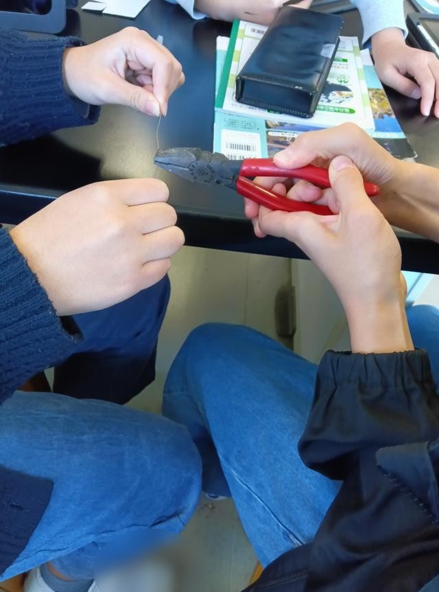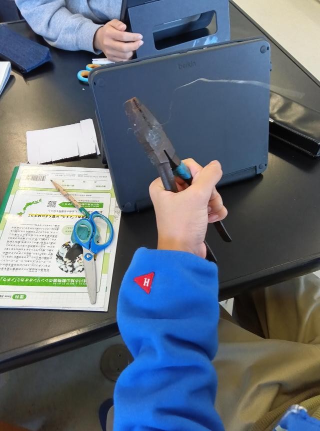 私が行ったときには、ペンチを使って針金を切り、様子を観察していました。ペンチは「第1のてこ」ですね。手前の力点に力が加わる(握る)と支点の先にある作用点も締まります。それで物をつかんだり、潰したりします。更に支点の近くには刃が付いているのでそれほど力を加えずに針金を切ることができます。・・・あまりペンチを使ったことがない児童が多いようで結構使い方に戸惑っていました。意外でしたが、確かに、プラモデルなどを作らないとあまり使わないかもしれませんね。