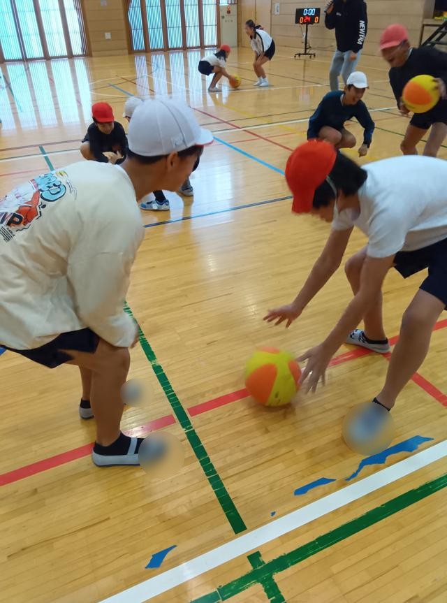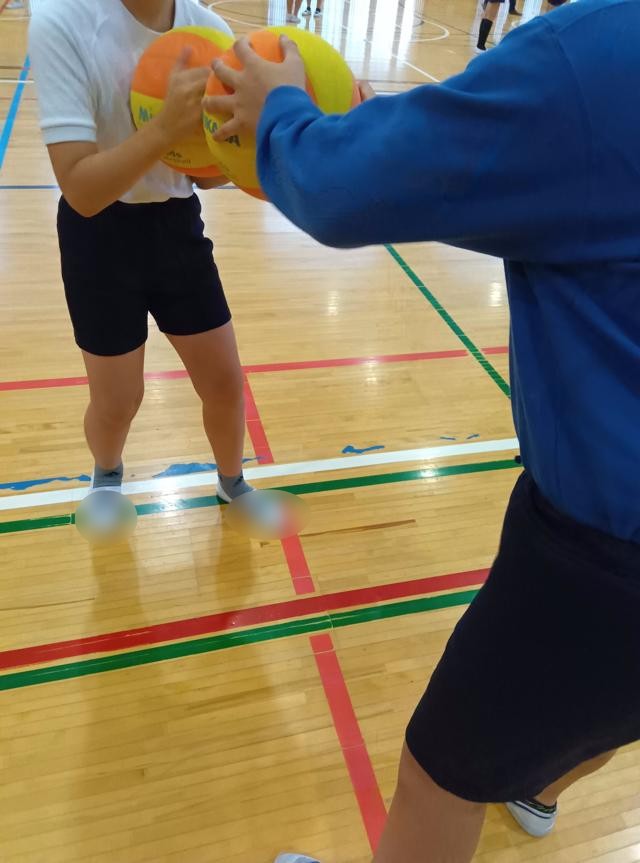 まずはウォーミングアップから。バスケットボールを使った押し相撲をしたり、ボールを高く投げて拍手(どこかで聞いたことがある・・・世田谷区立京西小学校 | 学校日記 | 12/3 ボール 1年生)する動きをしたりしていました。2人向かい合って、簡単なゲームもしています。「頭」「ひざ」「肩」・・・と、言われた体のいろいろな部分を触ります。「ボール」と言われたらボールを触った人の勝ちです。しばらくして慣れた頃に、