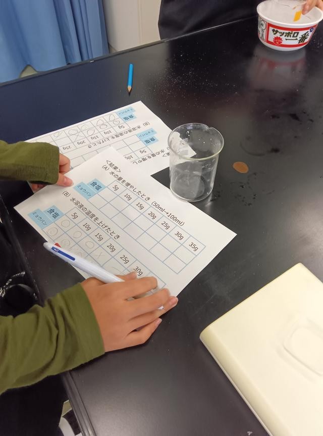 そんな修行のような実験を終え、さらによく溶かすための方法を考え実験をしていたのが、写真の前半です。温めることでよく溶けると予想した班は温めながら溶かしています。カップ麵の容器は保温性が高いのでそこにお湯を注いでいます。確かに常温よりは溶けやすくなりましたが、食塩はそれほど結果が変わりません。ただしミョウバンは・・・驚きの結果になったかもしれません。