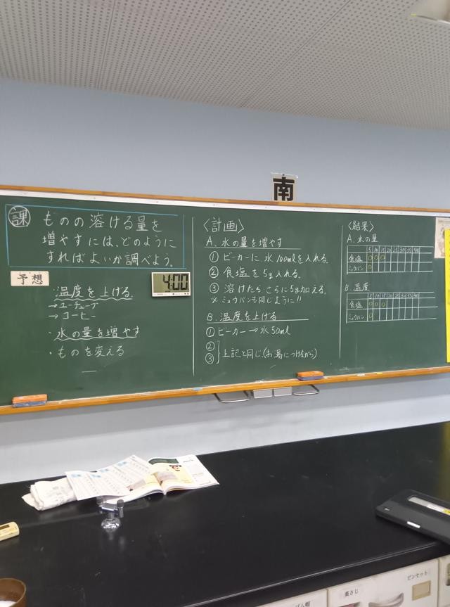 理科「ものの溶けかた」の学習で、実験が進む5年生です。この単元の授業にあまり出会えていなかったのですが、続けて実験をしているところに出会いましたので紹介します。
