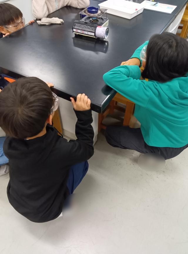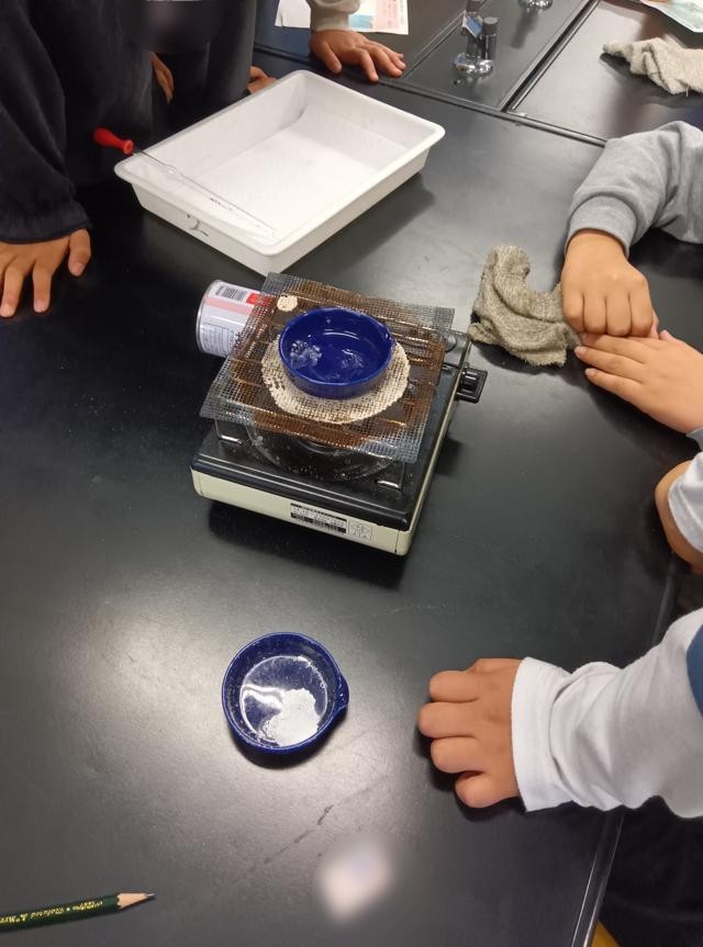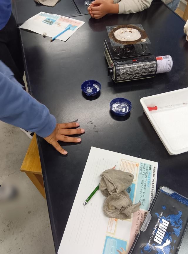 もう一つ見たのが後半の写真、溶かしたものを取り出すためにどうするかを考え、水溶液を熱して水分を飛ばし、溶けていたものを取り出す実験をしています。実験用の安全メガネをして、様子を観察していました。この実験は水分がなくなると塩が弾けだすので気を付けなくてはいけません。今回は、ふっと塩が浮いたあたりで火を止めて上手に観察していました。