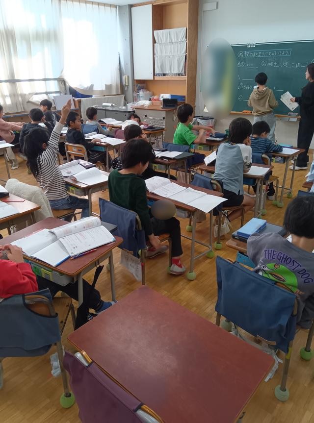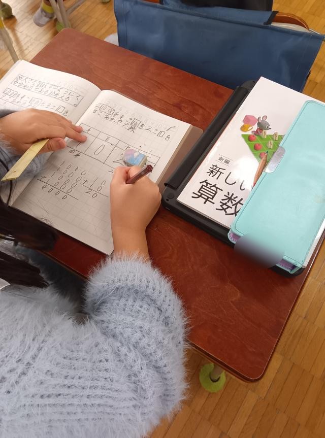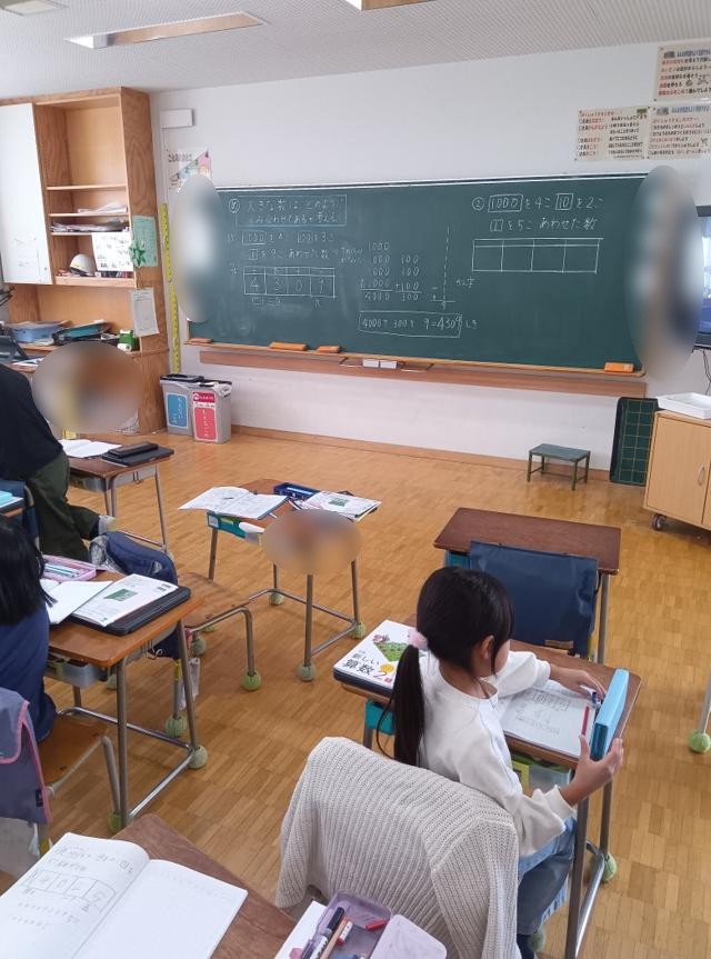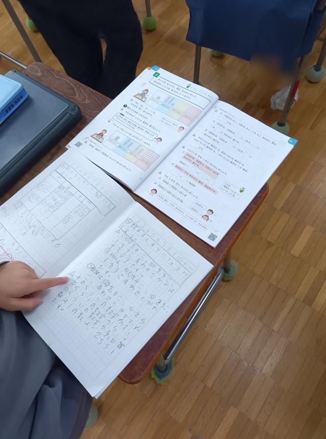 ということで、この日は、「何千何百何十何」という4ケタの数について学習していました。クラスにより少しやり方は違いますが、どのクラスでも「位」を大切に指導をしています。それぞれの位のまとまりがいくつあるか位ごとに丁寧に振り分け、上の位から読んでいきます。このあたりは、先日紹介した1年生の「まとまり」の考え方が徹底して入っています。