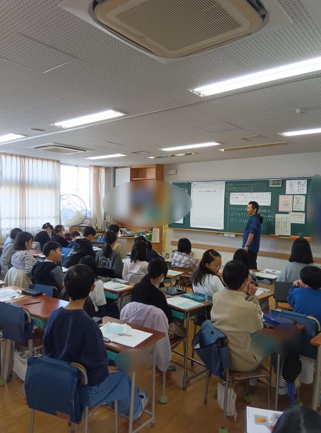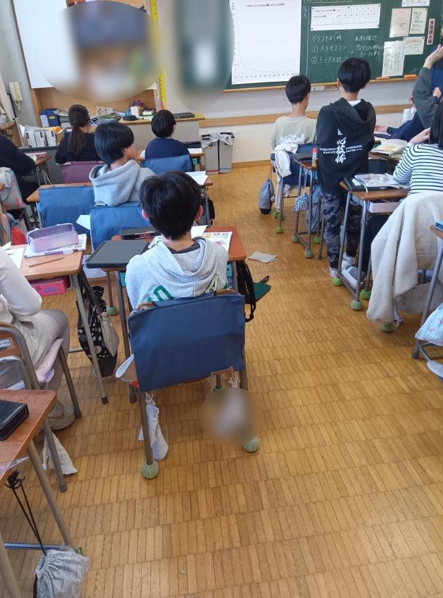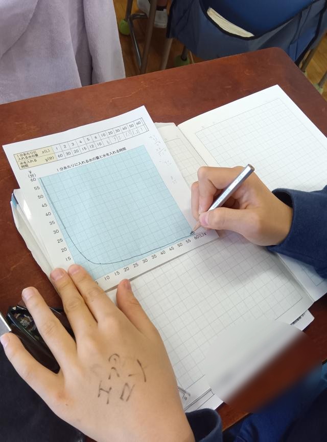 反比例のグラフって美しいと思いませんか。xの値が倍になると、yの値が1/2になるので、比例と違って直線のグラフにはならず、きれいな曲線を描きます。全体の量が少なくなると1/2になる数字も小さくなるので、変化の度合いも小さくなり、最後は少しずつ小さくなって、斜めの直線で数値を下げていきます。子どもたちも美しく描けたグラフを自慢するように見せてくれました。
