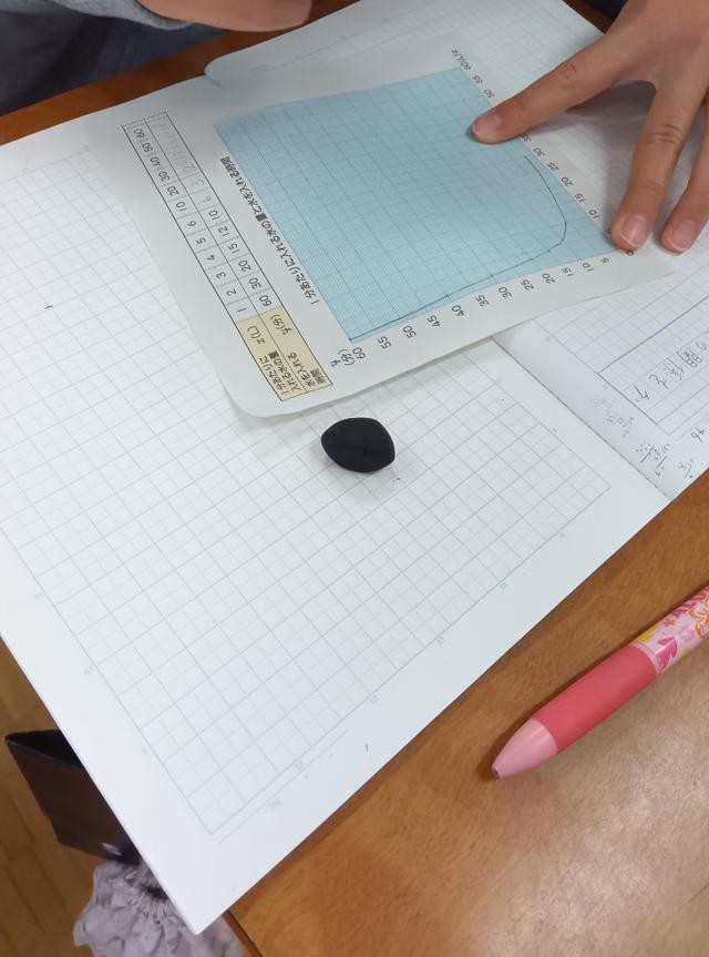 xの値が1ごとにyの値を出して線で結んでいきますが、気になったのか、0.1刻みで数値を出して点を打った子がいました。確かにグラフ上にyの値である数値が並んでいます。用紙の大きさからすこしガタガタして見えますが、もしももっと大きな紙であれば、より正確で滑らかな曲線を描いたことでしょう。ナイストライです。