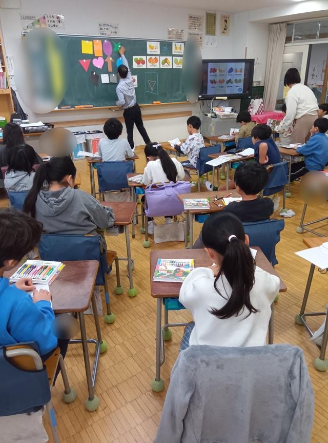 2年生の外国語活動です。黒板にいろいろな形が並んでいます。
