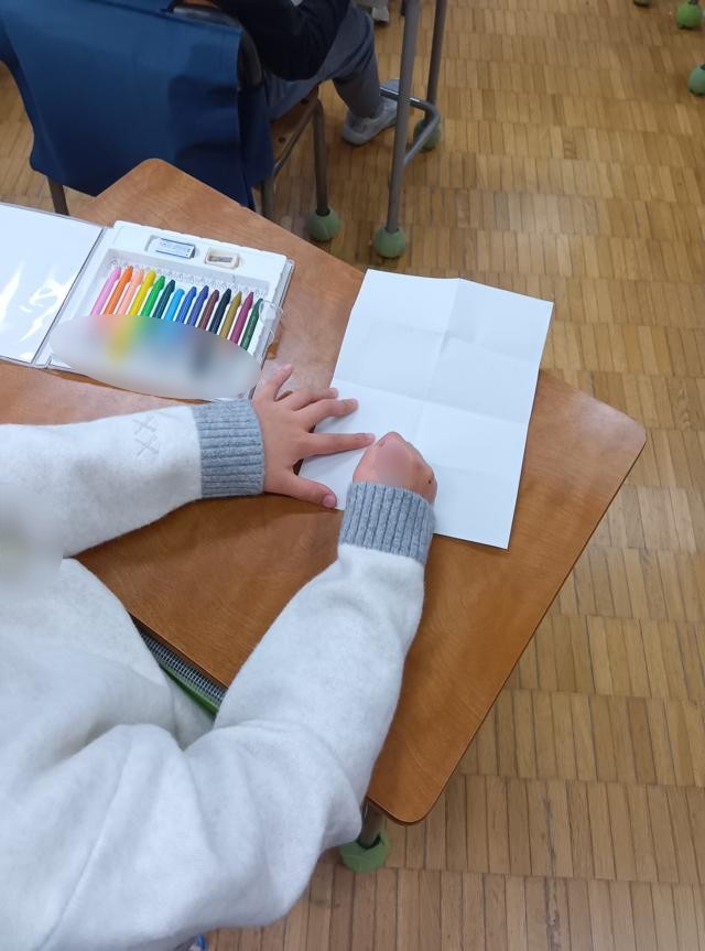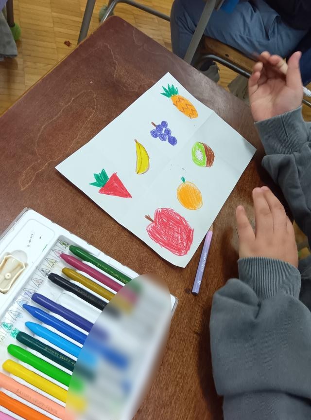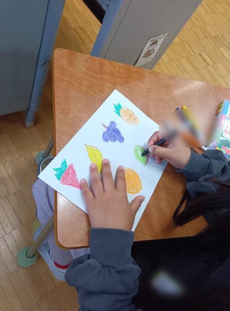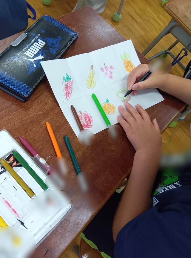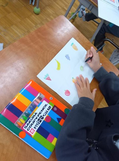 先生がその中から形と色を言い、言われたものを子どもたちは色付きで用紙に描いていきます。