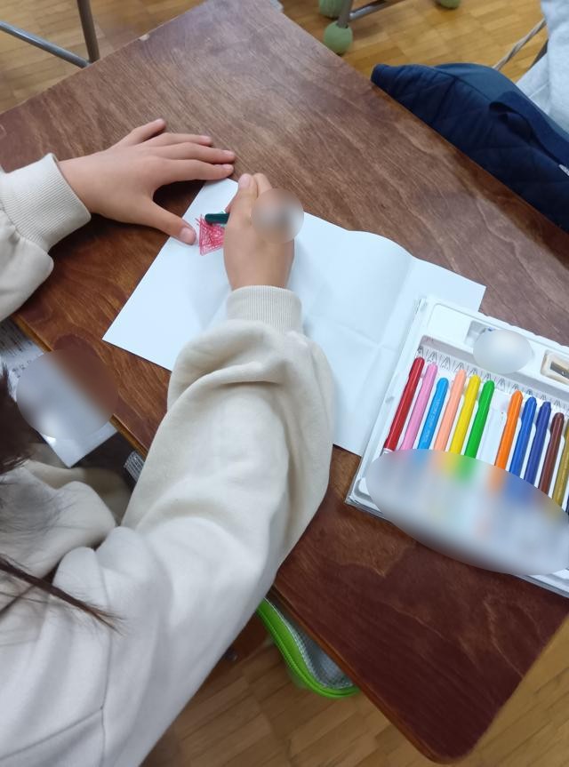 子どもたちは、形と色を聞き、描き始めます。初めて聞く「形」もあり、なかなか伝わらない問題もあります。そんな時は、先生が繰り返し、ゆっくり言ったり、ジェスチャーで示したりして、段々紙が絵で埋まっていきました。色は結構分かるんです。小さな頃から英語に触れる機会も多く、色は初めの方で覚える機会も多いです。私は小学校のとき「パープル」が紫のことだと知りませんでした。