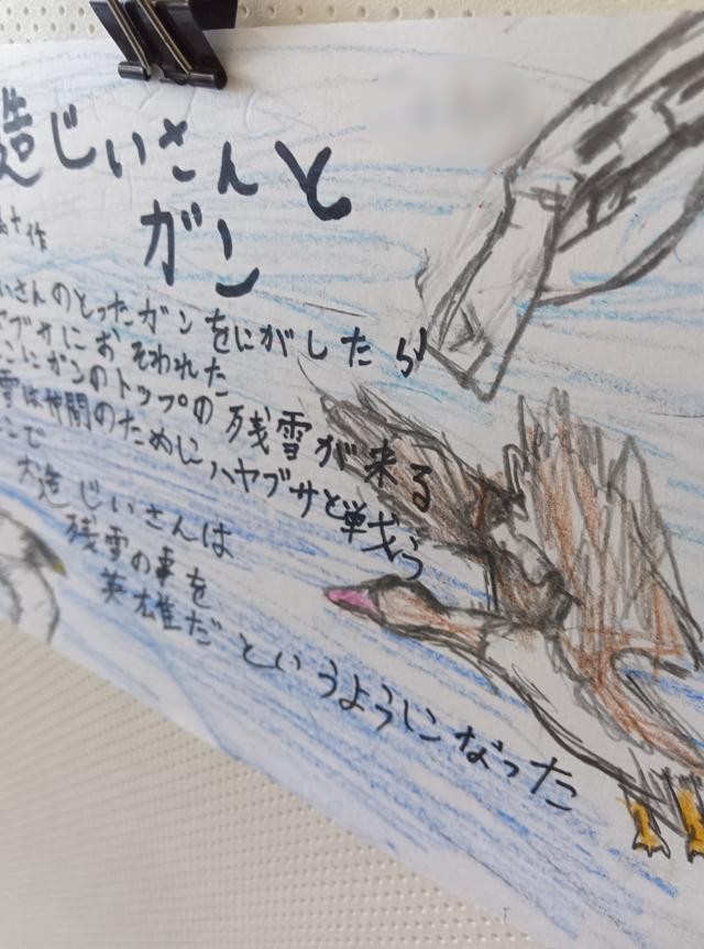 さて、廊下には「大造じいさんとがん」の学習の成果が掲示されていました。本、物語を紹介するPOPのようなものでしょうか。よくまとまっています。それから、その下にあるペットボトルを使った・・・作品?現段階では何の情報もありません。「大造じいさんとがん」・・・とは関係・・・ないですよね。(調べてみて、お伝えできそうな内容でしたら、続きをお伝えします。)