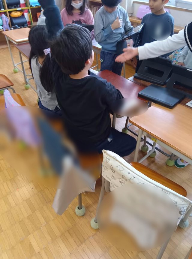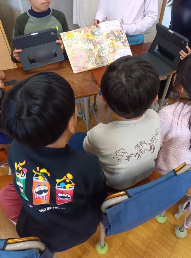 先日、国語の話し合いで決まった「おすすめの1さつ」、その本を3年生が1年生に読み聞かせをする交流がありました。