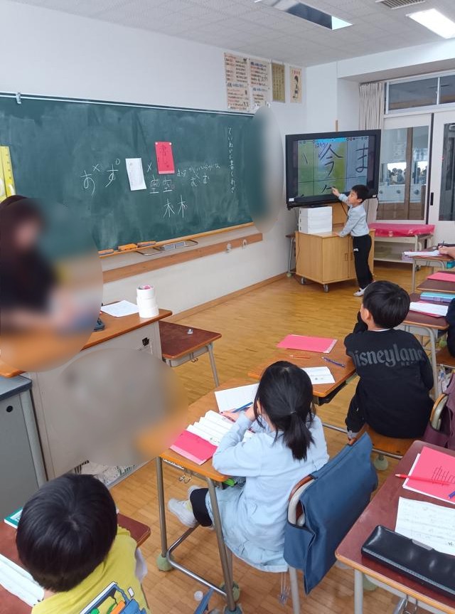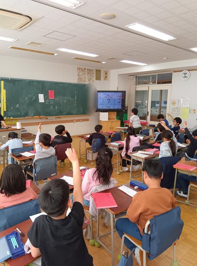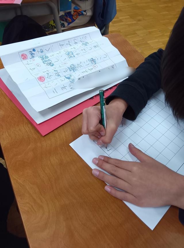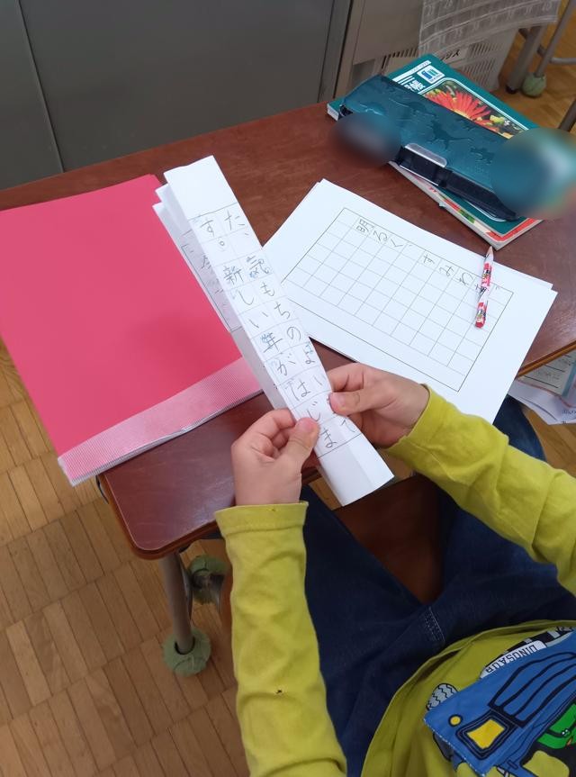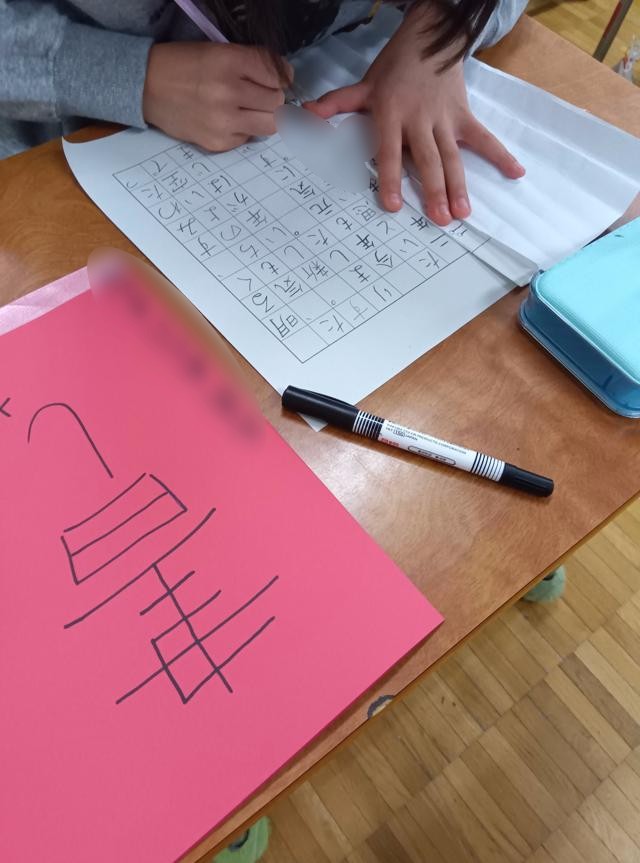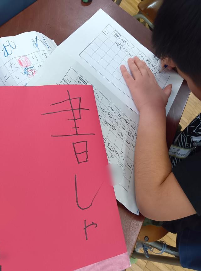 お手本を見て、注意すべき点やそれぞれの字を書くときにポイントをみんなで確認していました。お手本には、たくさんの書き込みがありました。裏にポイントを記している子もいました。お手絵本を折っているのは、自分が書くところのすぐ横にぴたっとお手本を並べて書けるようにです。その後、集中して練習に取り組んでいました。