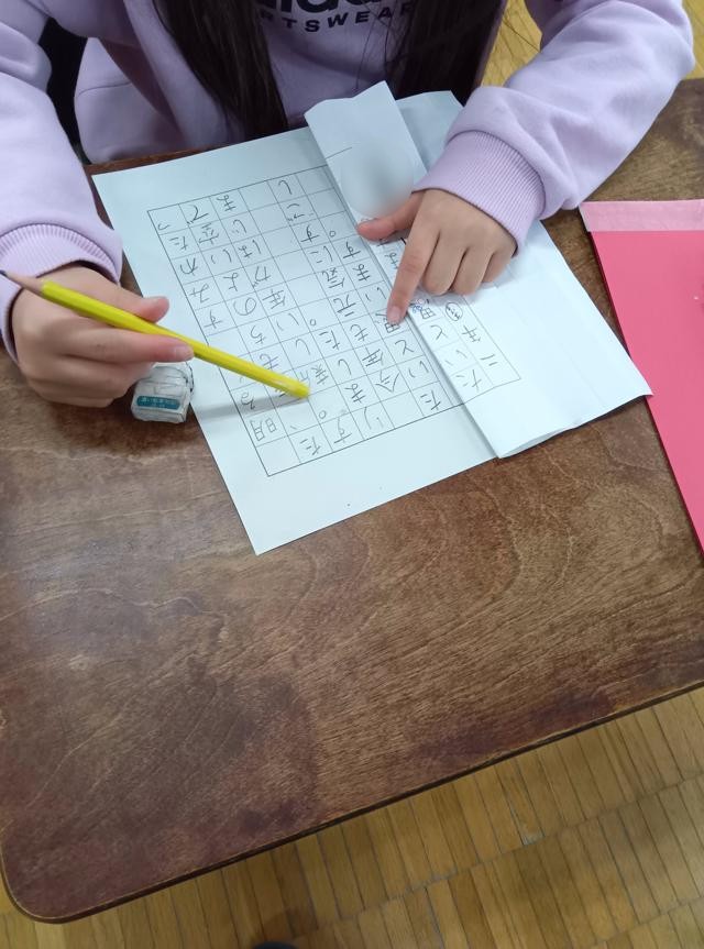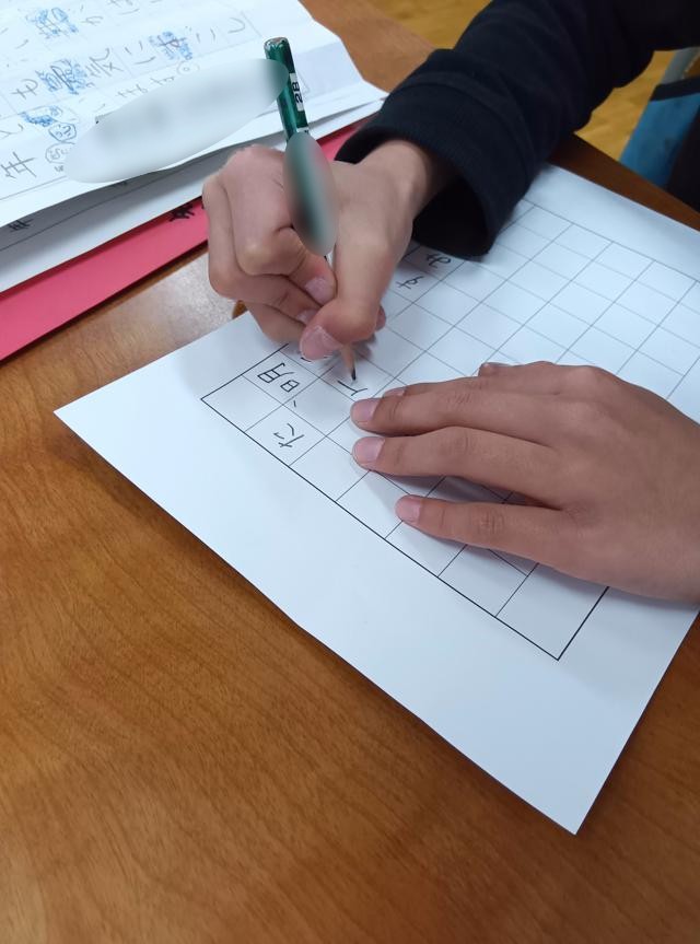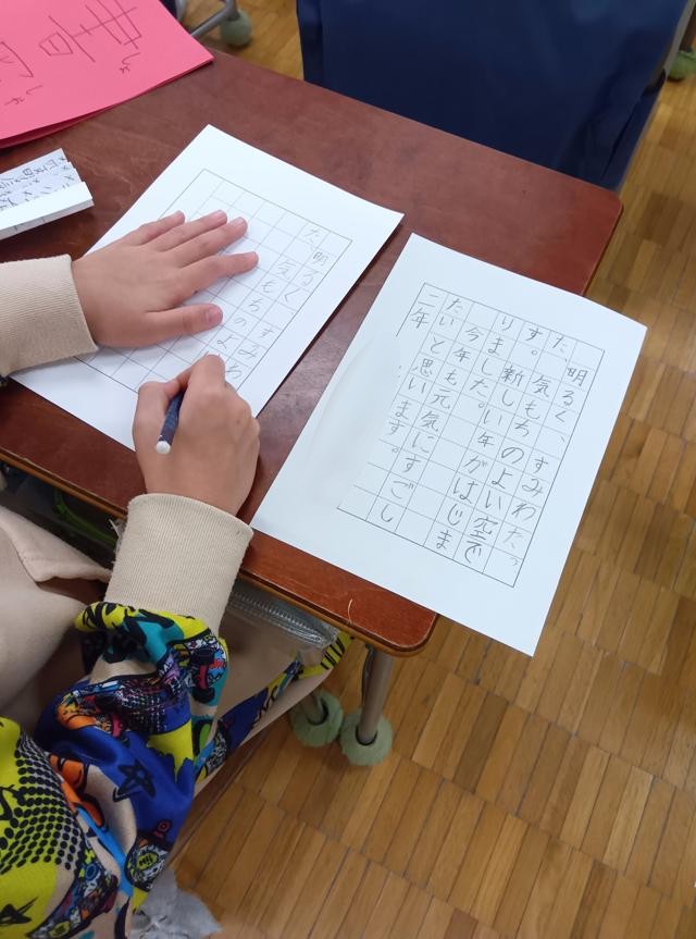 2年生が書き初めの練習をしていました。1・2年生の書き初めは「硬筆」、えんぴつで紙に書きます。