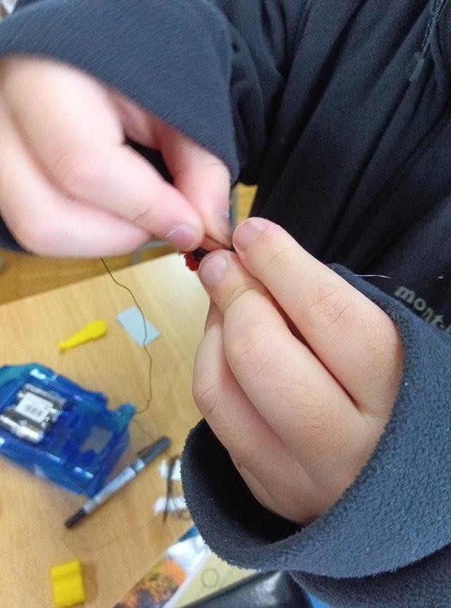 100回巻き付けます。端からきっちり詰めていき、逆に着いたら折り返してきますきっちり巻けると気持ちがいいです。ただやっていくうちにうまくいかずにからまったりするのはこの単元のあるあるです。ちなみに、このキットには、くるくる回すローラーのような道具も付いていたようですが、これを使うまでがなかなかうまくいかなかったようです。うまく進めるためには、